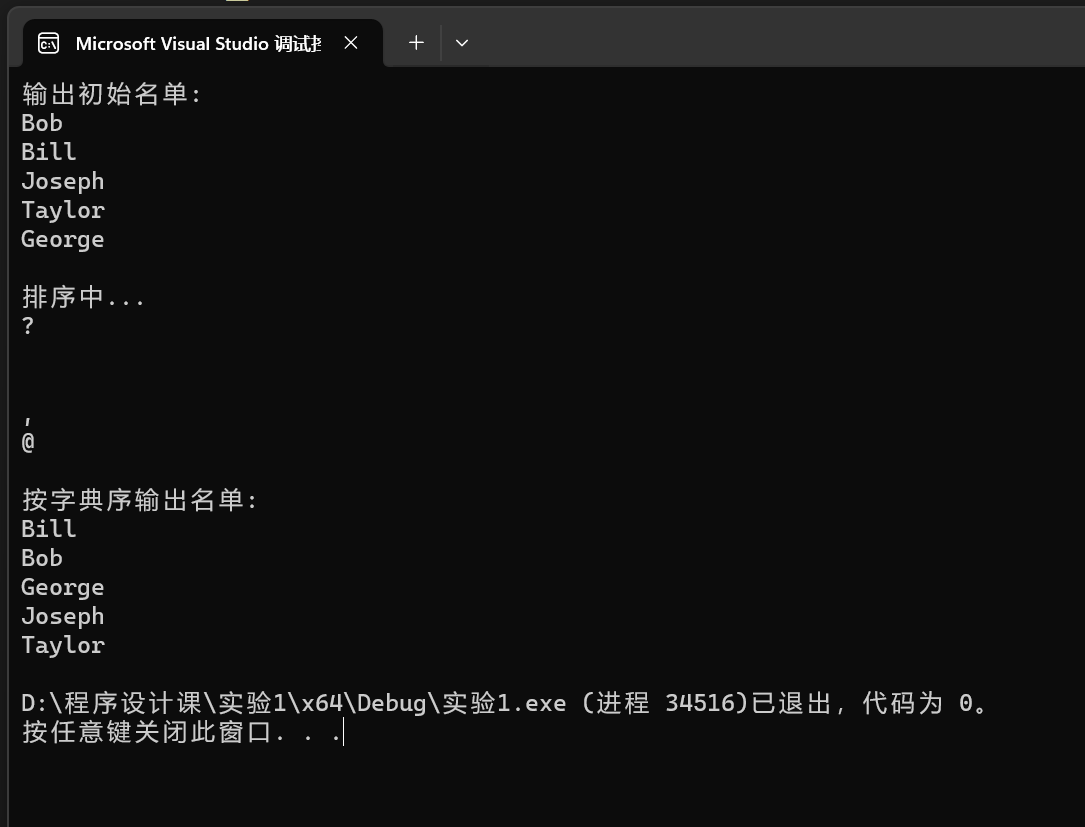 #include <stdio.h> #include <string.h> #define N 5 #define M 20 // 函数声明 void output(char str[][M], int n); void bubble_sort(char str[][M], int n); int main() { char name[][M] = {"Bob", "Bill", "Joseph", "Taylor", "George"}; int i; printf("输出初始名单:\n"); output(name, N); printf("\n排序中...\n"); bubble_sort(name, N); // 函数调用 printf("\n按字典序输出名单:\n"); output(name, N); return 0; } // 函数定义 // 功能:按行输出二维数组中的字符串 void output(char str[][M], int n) { int i; for(i = 0; i < n; ++i) printf("%s\n", str[i]); } void bubble_sort(char str[][M], int n){ int i, j; char t[20]; for(i=0;i<n-1;i++) { for(j=0;j<n-1-i;j++) { if(strcmp(str[j],str[j+1])>0) { strcpy(t,str[j]); strcpy(str[j],str[j+1]); strcpy(str[j+1],t); } } } for(i=0;i<n;i++) printf("%c\n",str[i]); }