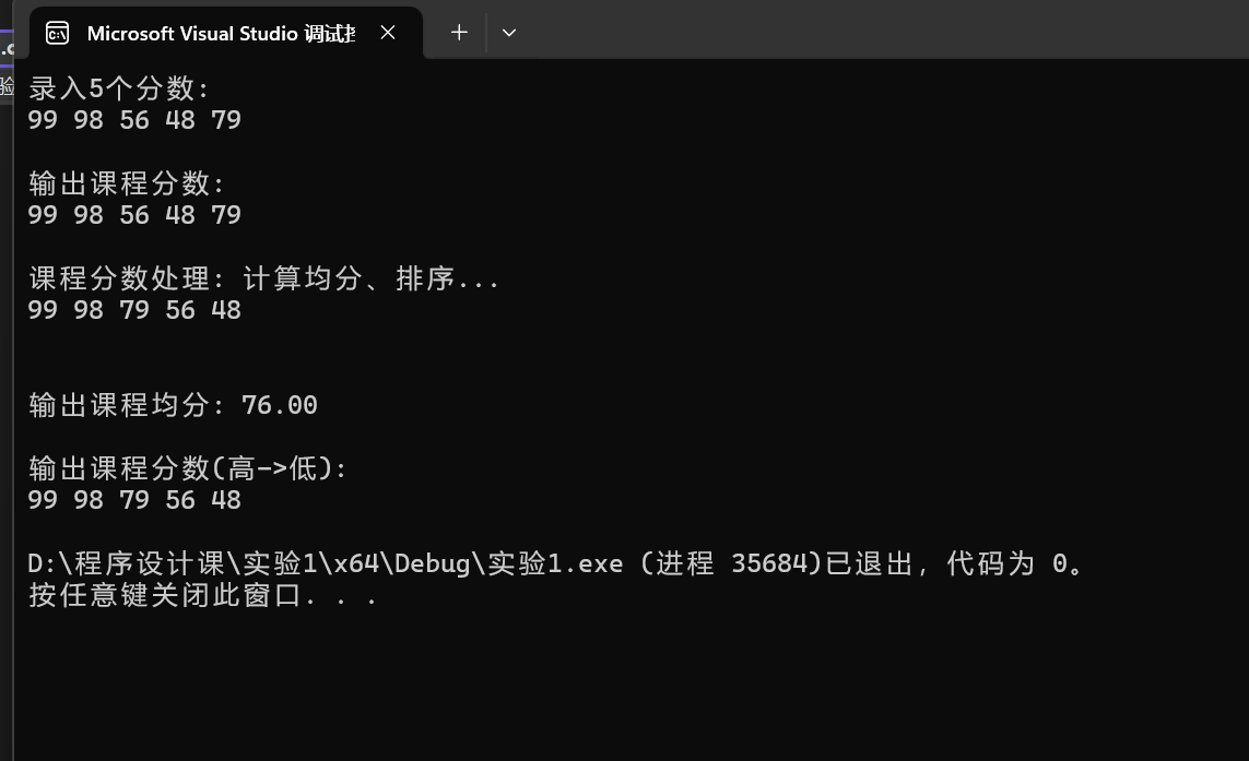 #include <stdio.h> #define N 5 // 函数声明 void input(int x[], int n); void output(int x[], int n); double average(int x[], int n); void bubble_sort(int x[], int n); int main() { int scores[N]; double ave; printf("录入%d个分数:\n", N); input(scores, N); printf("\n输出课程分数: \n"); output(scores, N); printf("\n课程分数处理: 计算均分、排序...\n"); ave = average(scores, N); bubble_sort(scores, N); printf("\n输出课程均分: %.2f\n", ave); printf("\n输出课程分数(高->低):\n"); output(scores, N); return 0; } // 函数定义 // 输入n个整数保存到整型数组x中 void input(int x[], int n) { int i; for (i = 0; i < n; ++i) scanf("%d", &x[i]); } // 输出整型数组x中n个元素 void output(int x[], int n) { int i; for (i = 0; i < n; ++i) printf("%d ", x[i]); printf("\n"); } // 计算整型数组x中n个元素均值,并返回 double average(int x[], int n) { double avg = 0.00; int i; for (i = 0; i < n; i++) avg += x[i]; return avg * 1.0 / n; } // 对整型数组x中的n个元素降序排序 void bubble_sort(int x[], int n) { int i, j; int t; for (i = 0; i < n - 1; i++) { for (j = 0; j < n - 1 - i; j++) { if (x[j] < x[j + 1]) { t = x[j]; x[j] = x[j + 1]; x[j + 1] = t; } } } for (i = 0; i < n; i++) printf("%d ", x[i]); printf("\n\n"); }