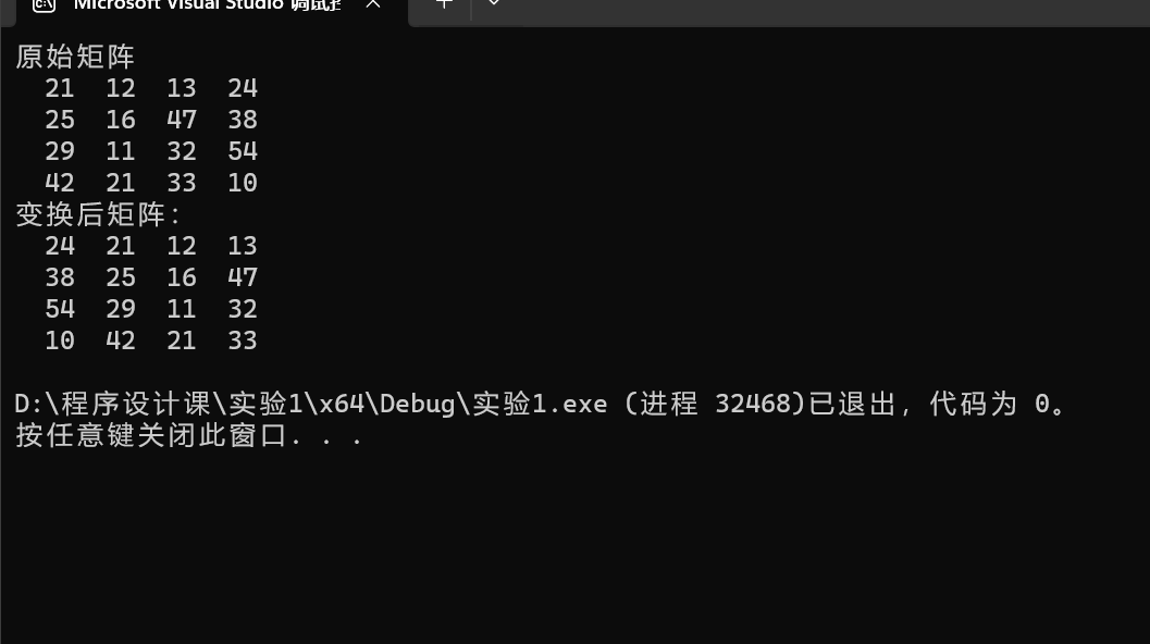 #include <stdio.h> #define N 100 #define M 4 // 鍑芥暟澹版槑 void output(int x[][N], int n); void rotate_to_right(int x[][N], int n); int main() { int t[][N] = { {21, 12, 13, 24}, {25, 16, 47, 38}, {29, 11, 32, 54}, {42, 21, 33, 10} }; printf("原始矩阵\n"); output(t, M); // 函数调用 rotate_to_right(t, M); // 函数调用 printf("变换后矩阵:\n"); output(t, M); //函数调用 return 0; } // 函数定义 //功能:输出一个n*n的矩阵x void output(int x[][N], int n) { int i, j; for (i = 0; i < n; ++i) { for (j = 0; j < n; ++j) printf("%4d", x[i][j]); printf("\n"); } } void rotate_to_right(int x[][N], int n) { int i, j; int b[100]; for (i = 0; i < n; i++) { b[i] = x[i][0]; x[i][0] = x[i][n - 1]; for (j = n - 1; j > 0; j--) { if (j == 1) x[i][j] = b[i]; else x[i][j] = x[i][j - 1]; } } }