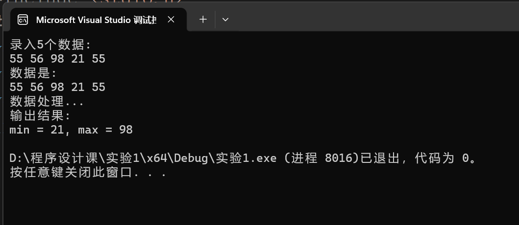 #include <stdio.h> #define N 5 void input(int x[], int n); void output(int x[], int n); void find_min_max(int x[], int n, int* pmin, int* pmax); int main() { int a[N]; int min, max; printf("录入%d个数据:\n", N); input(a, N); printf("数据是: \n"); output(a, N); printf("数据处理...\n"); find_min_max(a, N, &min, &max); printf("输出结果:\n"); printf("min = %d, max = %d\n", min, max); return 0; } void input(int x[], int n) { int i; for (i = 0; i < n; ++i) scanf("%d", &x[i]); } void output(int x[], int n) { int i; for (i = 0; i < n; ++i) printf("%d ", x[i]); printf("\n"); } void find_min_max(int x[], int n, int* pmin, int* pmax) { int i; *pmin = *pmax = x[0]; for (i = 1; i < n; ++i) if (x[i] < *pmin) *pmin = x[i]; else if (x[i] > *pmax) *pmax = x[i]; }