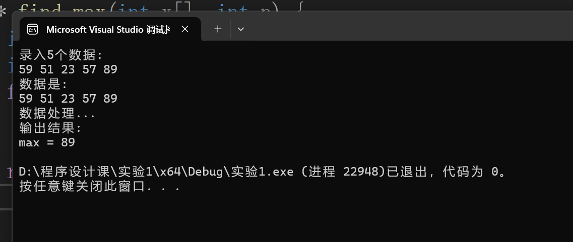 #include <stdio.h> #define N 5 void input(int x[], int n); void output(int x[], int n); int* find_max(int x[], int n); int main() { int a[N]; int* pmax; printf("录入%d个数据:\n", N); input(a, N); printf("数据是: \n"); output(a, N); printf("数据处理...\n"); pmax = find_max(a, N); printf("输出结果:\n"); printf("max = %d\n", *pmax); return 0; } void input(int x[], int n) { int i; for (i = 0; i < n; ++i) scanf("%d", &x[i]); } void output(int x[], int n) { int i; for (i = 0; i < n; ++i) printf("%d ", x[i]); printf("\n"); } int* find_max(int x[], int n) { int max_index = 0; int i; for (i = 1; i < n; ++i) if (x[i] > x[max_index]) max_index = i; return &x[max_index]; }