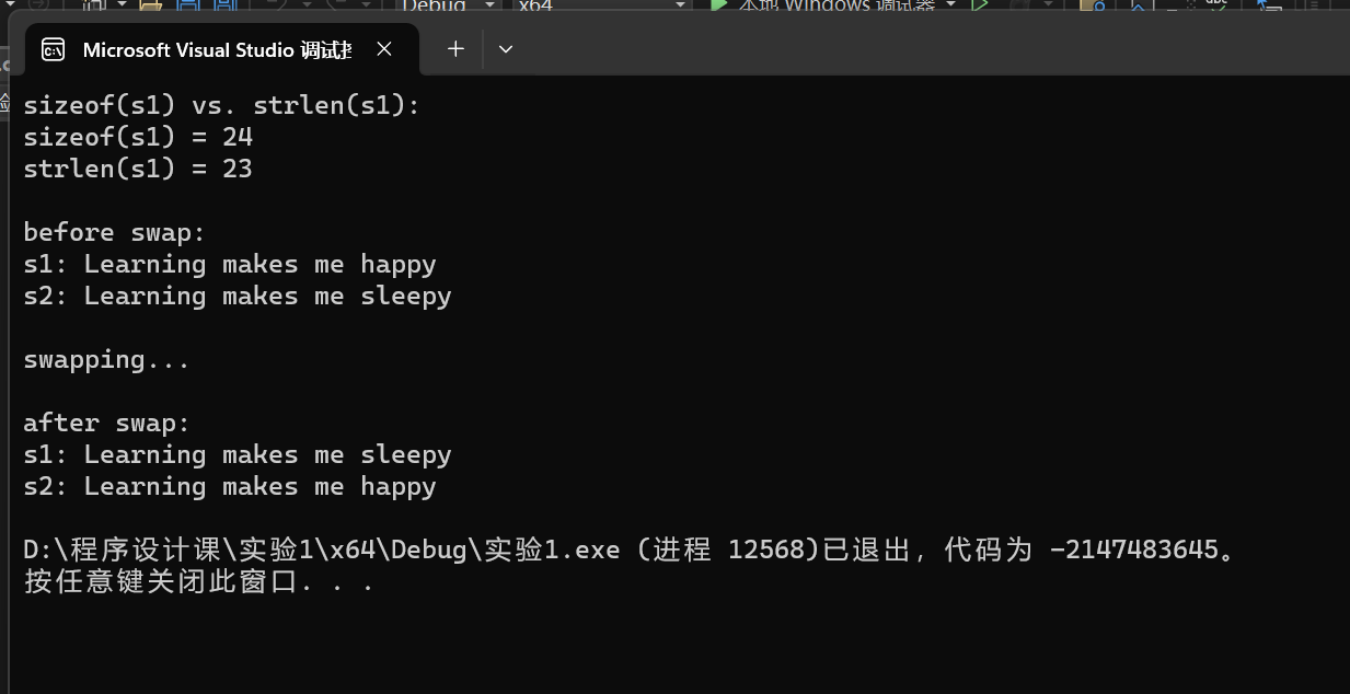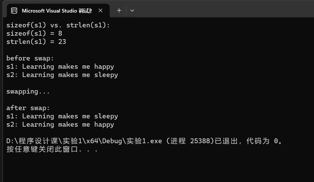 #include <stdio.h> #include <string.h> #define N 80 int main() { char* s1 = "Learning makes me happy"; char* s2 = "Learning makes me sleepy"; char* tmp; printf("sizeof(s1) vs. strlen(s1): \n"); printf("sizeof(s1) = %d\n", sizeof(s1)); printf("strlen(s1) = %d\n", strlen(s1)); printf("\nbefore swap: \n"); printf("s1: %s\n", s1); printf("s2: %s\n", s2); printf("\nswapping...\n"); tmp = s1; s1 = s2; s2 = tmp; printf("\nafter swap: \n"); printf("s1: %s\n", s1); printf("s2: %s\n", s2); return 0; }