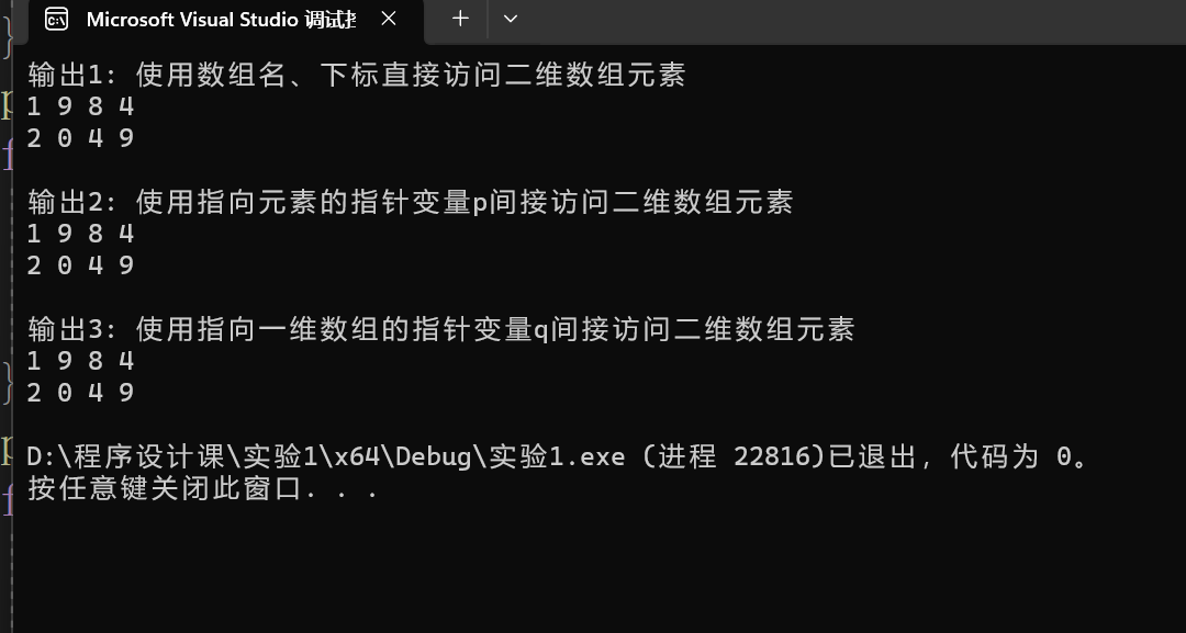 #include <stdio.h> #include <stdio.h> int main() { int x[2][4] = { {1, 9, 8, 4}, {2, 0, 4, 9} }; int i, j; int* ptr1; // 指针变量,存放int类型数据的地址 int(*ptr2)[4]; // 指针变量,指向包含4个int元素的一维数组 printf("输出1: 使用数组名、下标直接访问二维数组元素\n"); for (i = 0; i < 2; ++i) { for (j = 0; j < 4; ++j) printf("%d ", x[i][j]); printf("\n"); } printf("\n输出2: 使用指向元素的指针变量p间接访问二维数组元素\n"); for (ptr1 = &x[0][0], i = 0; ptr1 < &x[0][0] + 8; ++ptr1, ++i) { printf("%d ", *ptr1); if ((i + 1) % 4 == 0) printf("\n"); } printf("\n输出3: 使用指向一维数组的指针变量q间接访问二维数组元素\n"); for (ptr2 = x; ptr2 < x + 2; ++ptr2) { for (j = 0; j < 4; ++j) printf("%d ", *(*ptr2 + j)); printf("\n"); } return 0; }