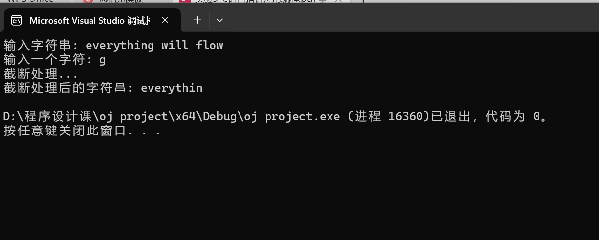 #include <stdio.h> #define N 80 void str_trunc(char* str, char x); int main() { char str[N]; char ch; printf("输入字符串: "); gets(str); printf("输入一个字符: "); ch = getchar(); printf("截断处理...\n"); str_trunc(str, ch); printf("截断处理后的字符串: %s\n", str); return 0; } void str_trunc(char* str, char x) { char* ptr = str; int found = 0; while (*ptr) { if (*ptr == x) { found = 1; } if (found) { *ptr = '\0'; // 将找到的字符及其后的字符置为字符串结束符 } ptr++; } }