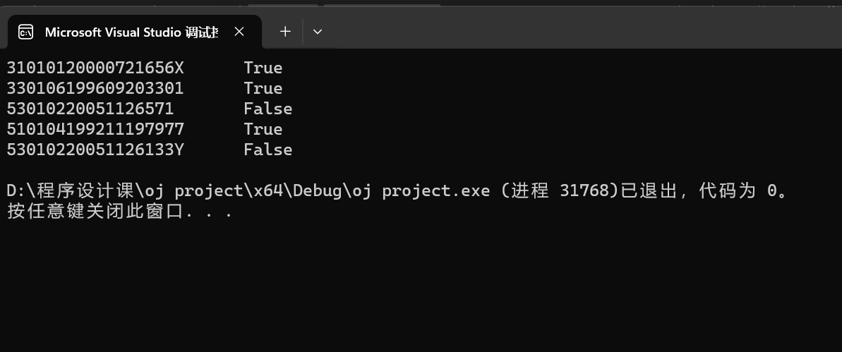 #include <stdio.h> #include <string.h> #include <ctype.h> #define N 5 int check_id(const char *str); // 更新的函数声明 int main() { const char *pid[N] = {"31010120000721656X", "330106199609203301", "53010220051126571", "510104199211197977", "53010220051126133Y"}; int i; for (i = 0; i < N; ++i) { if (check_id(pid[i])) printf("%s\tTrue\n", pid[i]); else printf("%s\tFalse\n", pid[i]); } return 0; } // 更新的函数定义 int check_id(const char *str) { if (strlen(str) != 18) { return 0; } int i; for (i = 0; i < 18; ++i) { if (!isdigit(str[i]) && !(str[i] == 'X' && i == 17)) { return 0; } } return 1; }