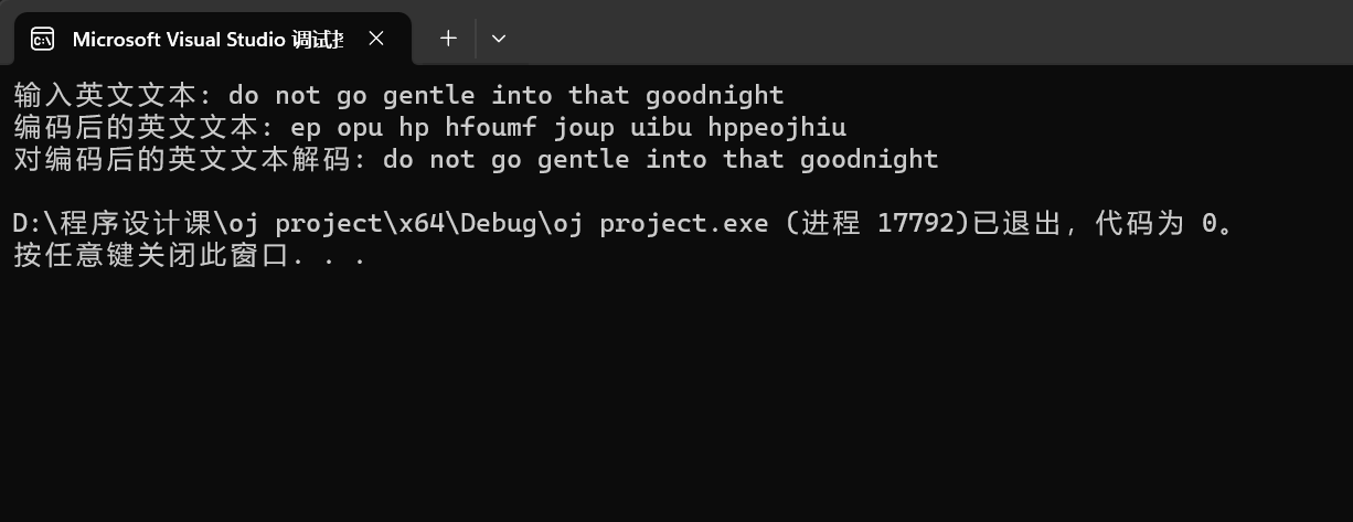 #include <stdio.h> #include <ctype.h> #define N 80 void encoder(char *str); // 函数声明 void decoder(char *str); // 函数声明 int main() { char words[N]; printf("输入英文文本: "); fgets(words, N, stdin); printf("编码后的英文文本: "); encoder(words); // 函数调用 printf("%s", words); printf("对编码后的英文文本解码: "); decoder(words); // 函数调用 printf("%s", words); return 0; } /*函数定义 功能:对s指向的字符串进行编码处理 编码规则: 对于a~z或A~Z之间的字母字符,用其后的字符替换; 其中,z用a替换,Z用A替换 其它非字母字符,保持不变 */ void encoder(char *str) { while (*str != '\0') { if (isalpha(*str)) { if ((*str >= 'a' && *str < 'z') || (*str >= 'A' && *str < 'Z')) { *str = *str + 1; } else if (*str == 'z' || *str == 'Z') { *str = *str - 25; } } str++; } } /*函数定义 功能:对s指向的字符串进行解码处理 解码规则: 对于a~z或A~Z之间的字母字符,用其前面的字符替换; 其中,a用z替换,A用Z替换 其它非字母字符,保持不变 */ void decoder(char *str) { while (*str != '\0') { if (isalpha(*str)) { if ((*str > 'a' && *str <= 'z') || (*str > 'A' && *str <= 'Z')) { *str = *str - 1; } else if (*str == 'a' || *str == 'A') { *str = *str + 25; } } str++; } }
