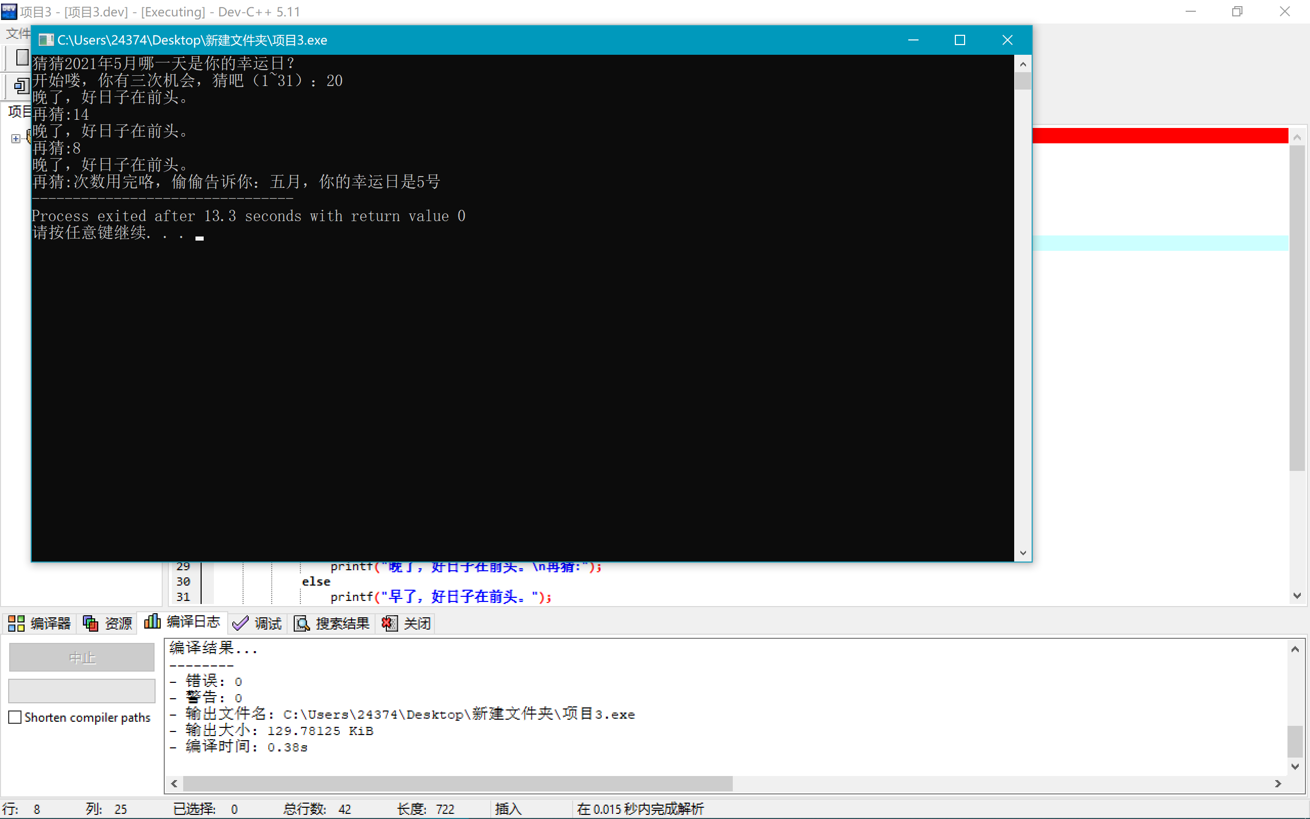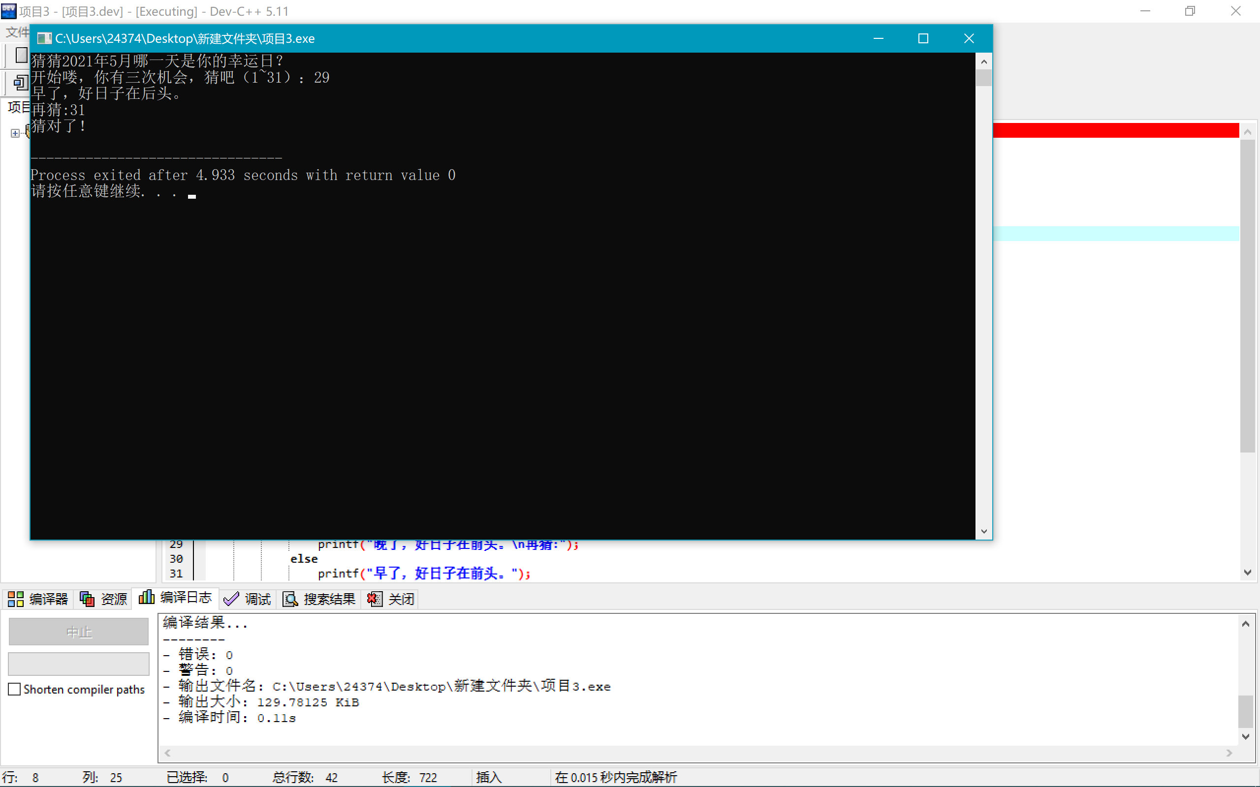 printf("猜猜2021年5月哪一天是你的幸运日?\n开始喽,你有三次机会,猜吧(1~31):");