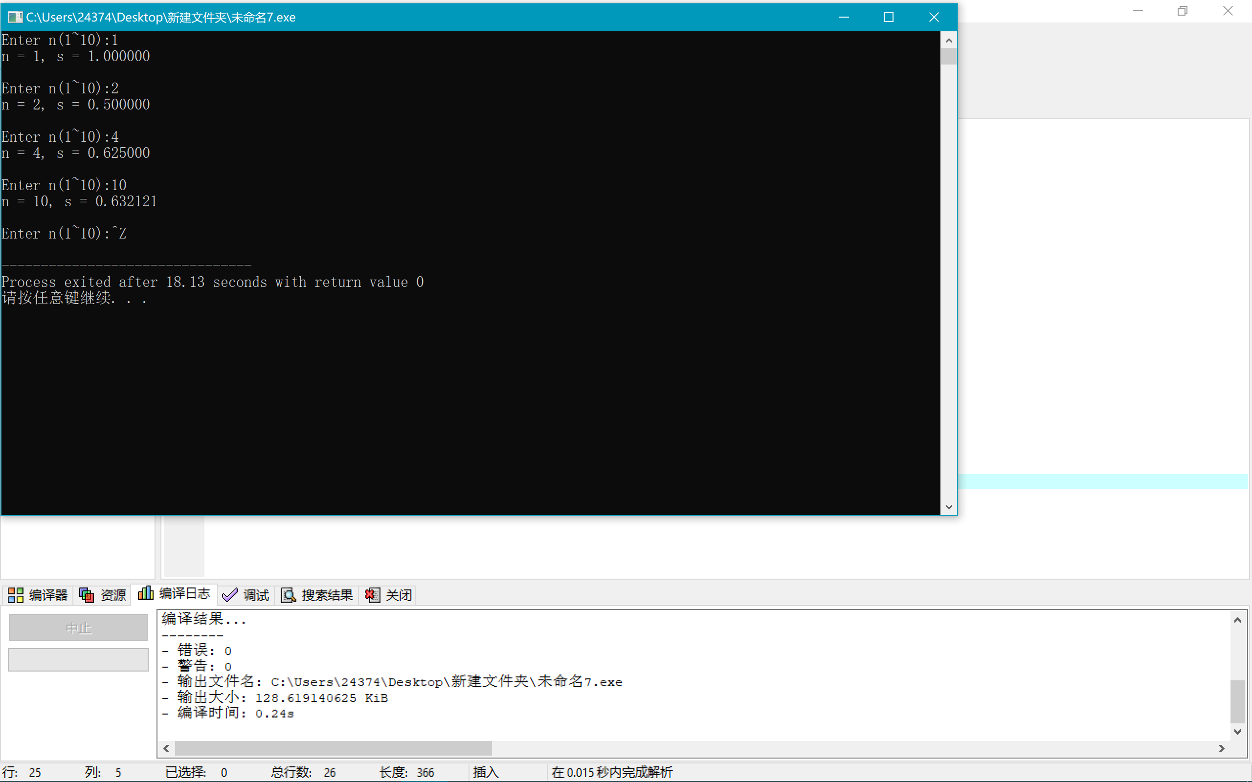 10 printf("n = %d, s = %f\n\n", n, s);