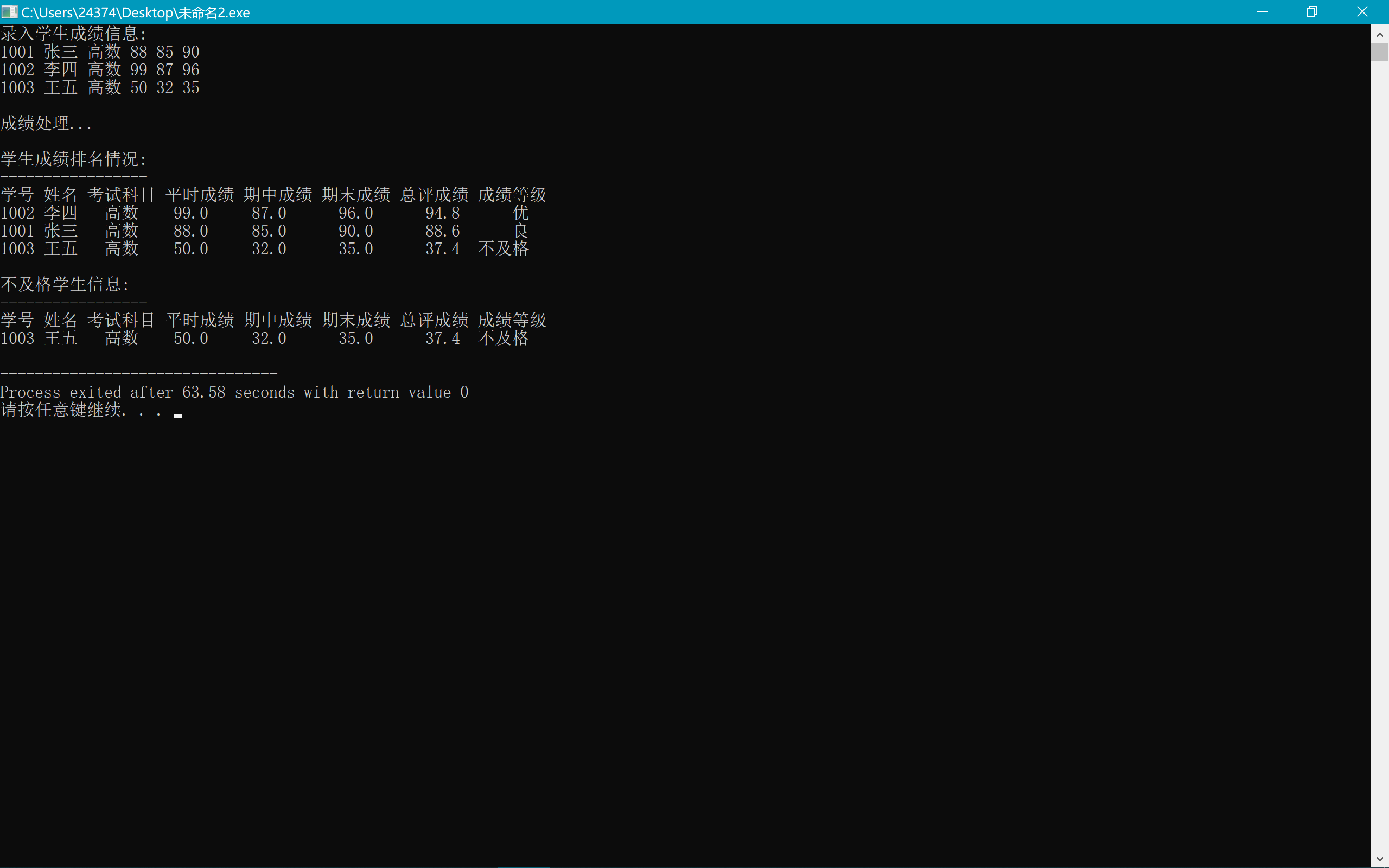 1 #include<stdio.h> 2 #include<stdlib.h> 3 #include<string.h> 4 #define N 3 5 6 typedef struct student{ 7 int id; 8 char name[20]; 9 char subject[20]; 10 float perf; 11 float mid; 12 float total; 13 float final; 14 char level[10]; 15 }STU; 16 17 void input(STU[],int ); 18 void calc(STU[],int); 19 int fail(STU[],STU [],int); 20 void sort(STU[],int); 21 void print(STU[], int); 22 23 int main(){ 24 STU st[N],fst[N]; 25 int k; 26 27 printf("录入学生成绩信息:\n"); 28 input(st,N); 29 30 printf("\n成绩处理...\n"); 31 calc(st,N); 32 33 k = fail(st,fst,N); 34 sort(st, N); 35 printf("\n学生成绩排名情况:\n"); 36 print(st, N); 37 38 printf("\n不及格学生信息:\n"); 39 40 print(fst, k); 41 return 0; 42 } 43 44 void input(STU s[],int n){ 45 int i; 46 for(i=0;i<n;i++) 47 scanf("%d %s %s %f %f %f", 48 &s[i].id,s[i].name,s[i].subject,&s[i].perf,&s[i].mid,&s[i].final); 49 } 50 51 void calc(STU s[],int n){ 52 int i; 53 for(i=0;i<n;i++){ 54 s[i].total=s[i].perf*0.2+s[i].mid*0.2+s[i].final*0.6; 55 56 if(s[i].total>=90) 57 strcpy(s[i].level,"优"); 58 else if(s[i].total>=80) 59 strcpy(s[i].level,"良"); 60 else if(s[i].total>=70) 61 strcpy(s[i].level,"中"); 62 else if(s[i].total>=60) 63 strcpy(s[i].level,"及格"); 64 else 65 strcpy(s[i].level,"不及格"); 66 } 67 } 68 69 int fail(STU s[],STU t[],int n) { 70 int i,k=0; 71 72 for(i=0;i<n;i++) 73 if(s[i].total<60) 74 t[k++]=s[i]; 75 76 return k; 77 } 78 79 void sort(STU s[],int n) { 80 int i,j; 81 STU temp; 82 83 for(i=0;i<n-1;i++) 84 for(j=0;j<n-i-1;j++) 85 if(s[j].total<s[j+1].total){ 86 temp = s[j]; 87 s[j] = s[j+1]; 88 s[j+1] = temp; 89 } 90 } 91 92 void print(STU s[], int n) { 93 int i; 94 printf("-----------------\n"); 95 printf("学号 姓名 考试科目 平时成绩 期中成绩 期末成绩 总评成绩 成绩等级\n"); 96 97 for(i=0;i<n;i++) 98 printf("%4d %4s %4s %5.1f %5.1f %5.1f %5.1f %6s\n", 99 s[i].id,s[i].name,s[i].subject,s[i].perf,s[i].mid,s[i].final,s[i].total,s[i].level); 100 }