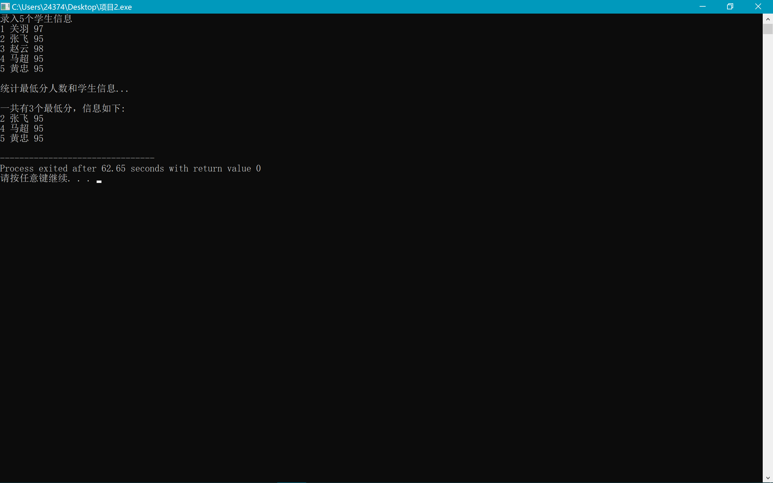 1 #include <stdio.h> 2 const int N=5; 3 // 定义结构体类型struct student,并定义STU为其别名 4 typedef struct student { 5 long no; 6 char name[20]; 7 int score; 8 }STU; 9 // 函数声明 10 void input(STU s[], int n); 11 int findMinlist(STU s[], STU t[], int n); 12 void output(STU s[], int n); 13 14 int main() { 15 STU stu[N], minlist[N]; 16 int count; 17 18 printf("录入%d个学生信息\n", N); 19 input(stu, N); 20 21 printf("\n统计最低分人数和学生信息...\n"); 22 count = findMinlist(stu, minlist, N); 23 24 printf("\n一共有%d个最低分,信息如下:\n", count); 25 output(minlist, count); 26 27 return 0; 28 } 29 30 void input(STU s[], int n) { 31 int i; 32 for(i=0; i<n; i++) 33 scanf("%ld %s %d", &s[i].no, s[i].name, &s[i].score); 34 } 35 36 void output(STU s[], int n) { 37 int i; 38 for(i=0; i<n; i++) 39 printf("%ld %s %d\n", s[i].no, s[i].name, s[i].score); 40 } 41 42 int findMinlist(STU s[], STU t[], int n){ 43 int i, j=0, min; 44 min=s[0].score; //初始化最低分 45 for(i=0;i<n;i++){ 46 if(s[i].score<min) 47 min = s[i].score; 48 } //遍历数组,找到最低分 49 50 for(i=0;i<n;i++){ 51 if(s[i].score==min) 52 t[j++]=s[i]; 53 } //遍历数组,统计最低分 54 55 return j; 56 }