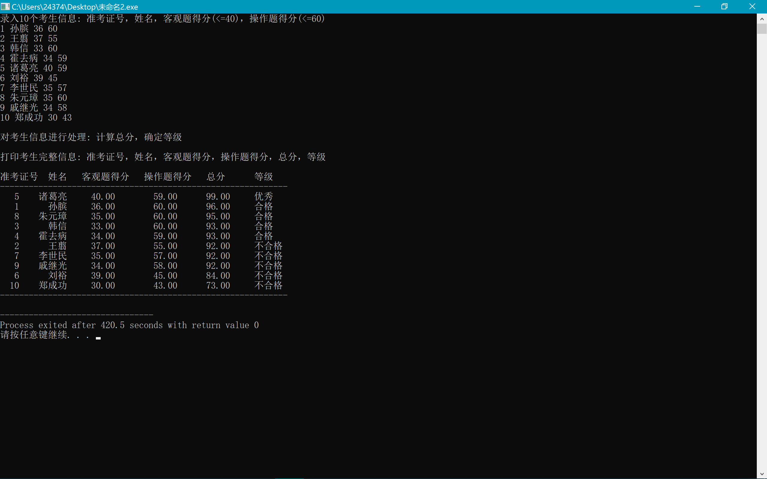 1 #include<stdio.h> 2 #include<string.h> 3 const int N = 10; 4 5 typedef struct student{ 6 long int id; 7 char name[20]; 8 float obj; 9 float sub; 10 float sum; 11 char level[10]; 12 }STU; 13 14 void input(STU s[],int n); 15 void output(STU s[],int n); 16 void process(STU s[],int n); 17 18 int main(){ 19 STU stu[N]; 20 21 printf("录入%d个考生信息: 准考证号,姓名,客观题得分(<=40),操作题得分(<=60)\n", N); 22 input(stu, N); 23 24 printf("\n对考生信息进行处理: 计算总分,确定等级\n"); 25 process(stu, N); 26 27 printf("\n打印考生完整信息: 准考证号,姓名,客观题得分,操作题得分,总分,等级\n\n"); 28 output(stu, N); 29 30 return 0; 31 } 32 33 void input(STU s[],int n){ 34 int i; 35 for(i=0;i<n;i++) 36 scanf("%d%s%f%f", &s[i].id, s[i].name, &s[i].obj, &s[i].sub); 37 } 38 39 void output(STU s[],int n){ 40 int i; 41 printf("准考证号 姓名 客观题得分 操作题得分 总分 等级\n"); 42 printf("------------------------------------------------------------\n"); 43 for(i=0;i<n;i++) 44 printf("%4ld %6s %5.2f %.2f %6.2f %4s\n", s[i].id, s[i].name, s[i].obj, s[i].sub, s[i].sum, s[i].level); 45 printf("------------------------------------------------------------\n"); 46 } 47 48 void process(STU s[],int n){ 49 int i,j,k; 50 STU temp; 51 for(i=0;i<n;i++){ 52 s[i].sum = s[i].sub + s[i].obj; 53 } 54 55 for(i=0;i<n-1;i++) 56 for(j=0;j<n-i-1;j++) 57 if(s[j].sum < s[j+1].sum){ 58 temp=s[j]; 59 s[j]=s[j+1]; 60 s[j+1]=temp; 61 } 62 63 for(i=0;i<n;i++){ 64 k=i+1; 65 66 if((float(k)/n)<0.2) strcpy(s[i].level,"优秀"); 67 else if((float(k)/n)<0.6) strcpy(s[i].level,"合格"); 68 else strcpy(s[i].level,"不合格"); 69 } 70 }