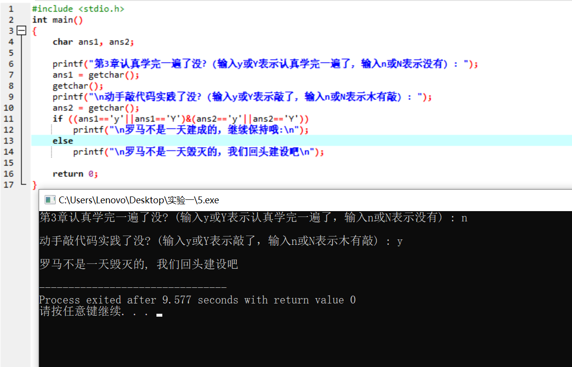 #include <stdio.h> int main() { char ans1, ans2; printf("第3章认真学完一遍了没? (输入y或Y表示认真学完一遍了,输入n或N表示没有) : "); ans1 = getchar(); getchar(); printf("\n动手敲代码实践了没? (输入y或Y表示敲了,输入n或N表示木有敲) : "); ans2 = getchar(); if ((ans1=='y'||ans1=='Y')&(ans2=='y'||ans2=='Y')) printf("\n罗马不是一天建成的, 继续保持哦:\n"); else printf("\n罗马不是一天毁灭的, 我们回头建设吧\n"); return 0; }
