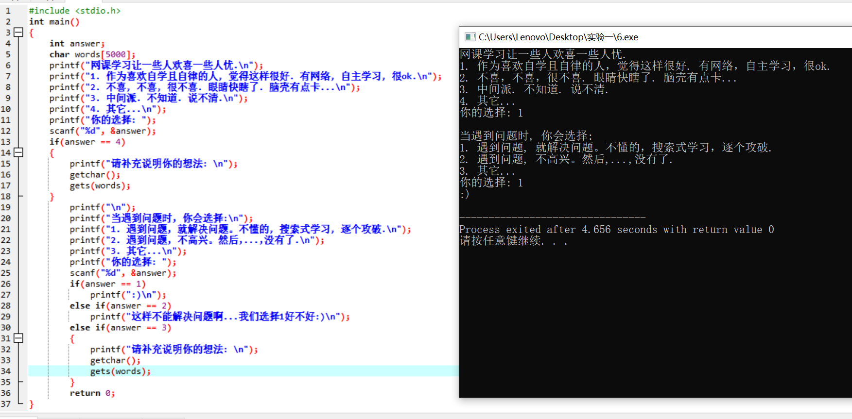 #include <stdio.h> int main() { int answer; char words[5000]; printf("网课学习让一些人欢喜一些人忧.\n"); printf("1. 作为喜欢自学且自律的人,觉得这样很好. 有网络,自主学习,很ok.\n"); printf("2. 不喜,不喜,很不喜. 眼睛快瞎了. 脑壳有点卡...\n"); printf("3. 中间派. 不知道. 说不清.\n"); printf("4. 其它...\n"); printf("你的选择: "); scanf("%d", &answer); if(answer == 4) { printf("请补充说明你的想法: \n"); getchar(); gets(words); } printf("\n"); printf("当遇到问题时, 你会选择:\n"); printf("1. 遇到问题, 就解决问题。不懂的,搜索式学习,逐个攻破.\n"); printf("2. 遇到问题, 不高兴。然后,...,没有了.\n"); printf("3. 其它...\n"); printf("你的选择: "); scanf("%d", &answer); if(answer == 1) printf(":)\n"); else if(answer == 2) printf("这样不能解决问题啊...我们选择1好不好:)\n"); else if(answer == 3) { printf("请补充说明你的想法: \n"); getchar(); gets(words); } return 0; }