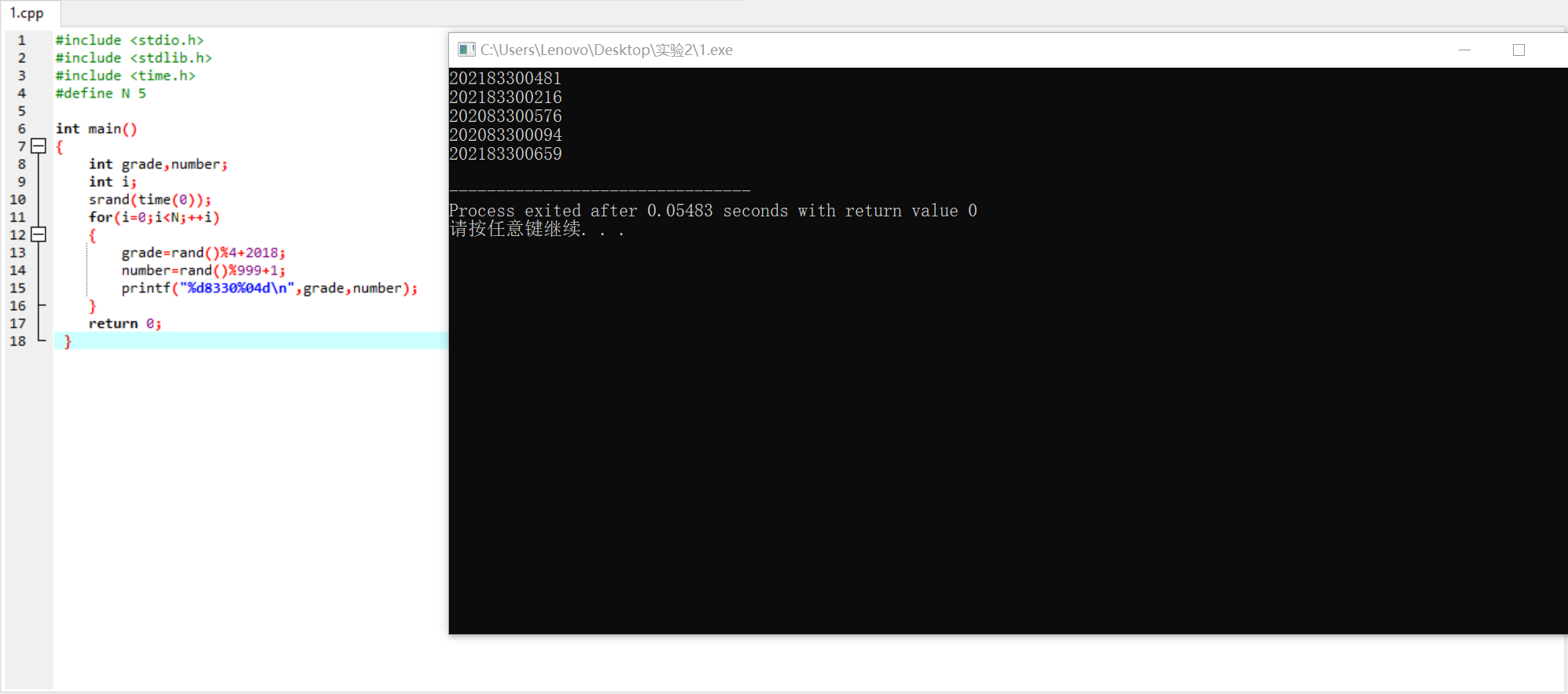 #include <stdio.h> #include <stdlib.h> #include <time.h> #define N 5 int main() { int grade,number; int i; srand(time(0)); for(i=0;i<N;++i) { grade=rand()%4+2018; number=rand()%999+1; printf("%d8330%04d\n",grade,number); } return 0; }