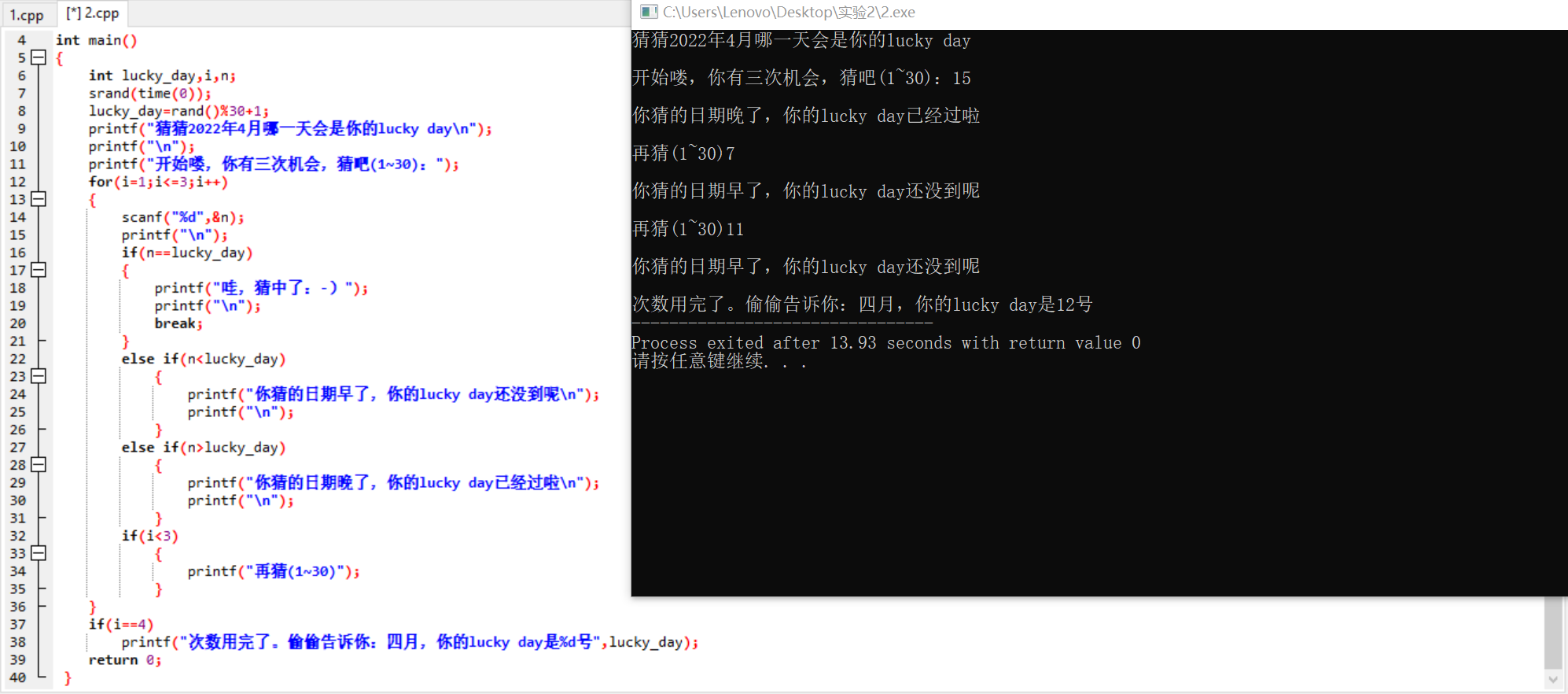 #include <stdio.h> #include <stdlib.h> #include <time.h> int main() { int lucky_day,i,n; srand(time(0)); lucky_day=rand()%30+1; printf("猜猜2022年4月哪一天会是你的lucky day\n"); printf("\n"); printf("开始喽,你有三次机会,猜吧(1~30):"); for(i=1;i<=3;i++) { scanf("%d",&n); printf("\n"); if(n==lucky_day) { printf("哇,猜中了:-)"); printf("\n"); break; } else if(n<lucky_day) { printf("你猜的日期早了,你的lucky day还没到呢\n"); printf("\n"); } else if(n>lucky_day) { printf("你猜的日期晚了,你的lucky day已经过啦\n"); printf("\n"); } if(i<3) { printf("再猜(1~30)"); } } if(i==4) printf("次数用完了。偷偷告诉你:四月,你的lucky day是%d号",lucky_day); return 0; }