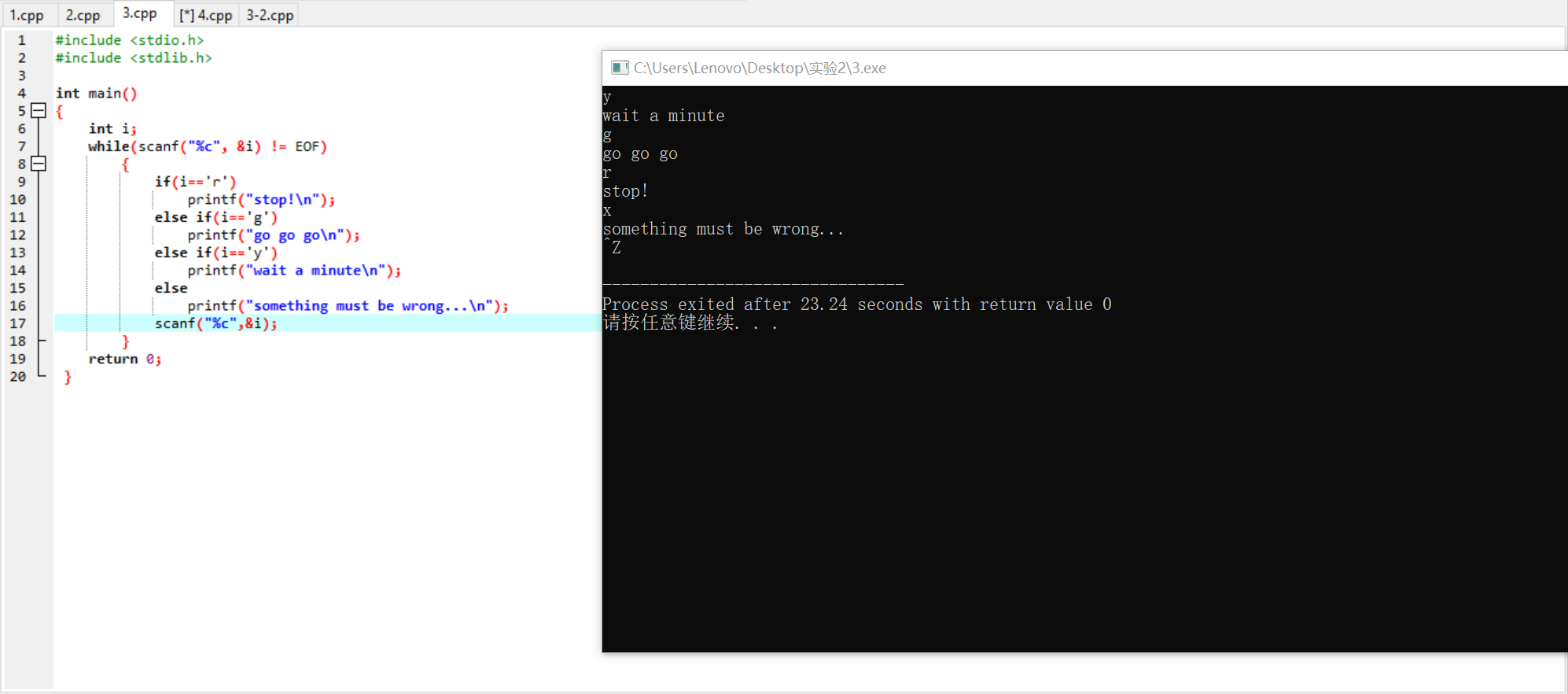 #include <stdio.h> #include <stdlib.h> int main() { int i; while(scanf("%c", &i) != EOF) { if(i=='r') printf("stop!\n"); else if(i=='g') printf("go go go\n"); else if(i=='y') printf("wait a minute\n"); else printf("something must be wrong...\n"); scanf("%c",&i); } return 0; }