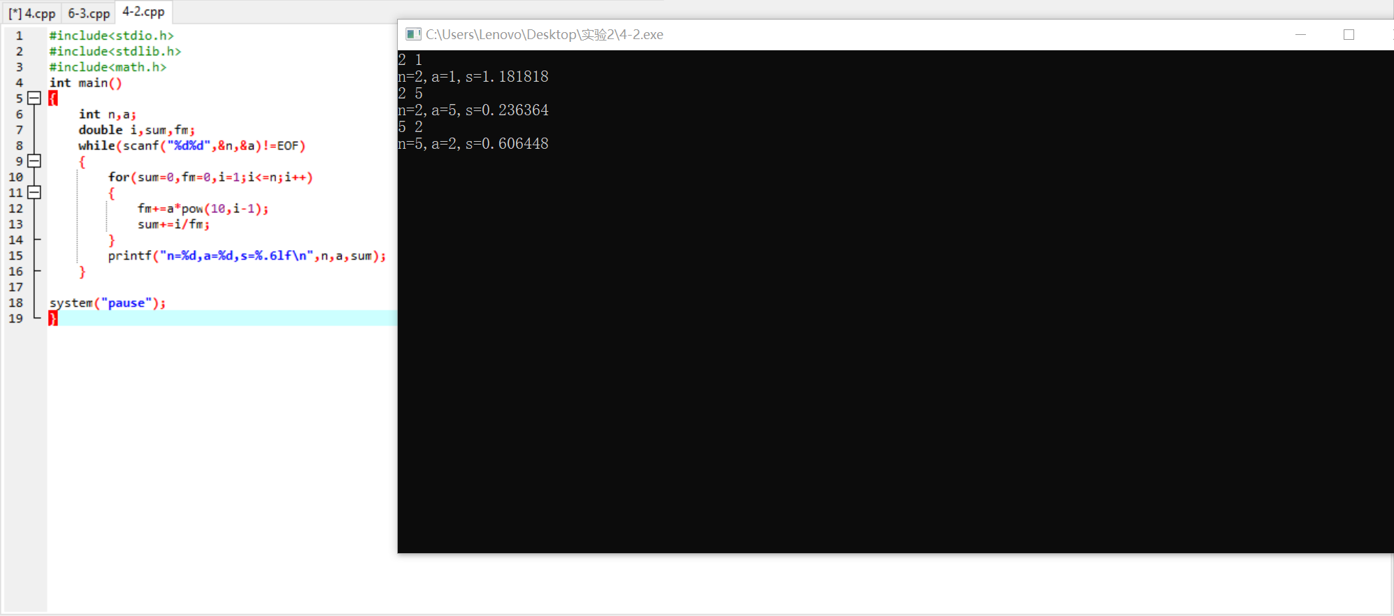 #include<stdio.h> #include<stdlib.h> #include<math.h> int main() { int n,a; double i,sum,fm; while(scanf("%d%d",&n,&a)!=EOF) { for(sum=0,fm=0,i=1;i<=n;i++) { fm+=a*pow(10,i-1); sum+=i/fm; } printf("n=%d,a=%d,s=%.6lf\n",n,a,sum); } system("pause"); }
