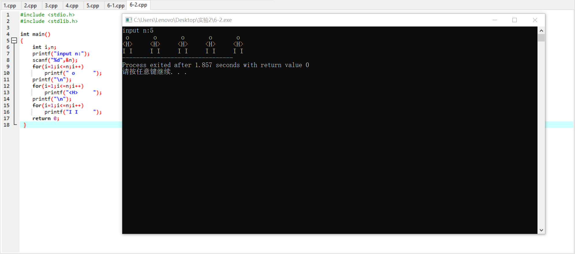 #include <stdio.h> #include <stdlib.h> int main() { int i,n; printf("input n:"); scanf("%d",&n); for(i=1;i<=n;i++) { printf(" o \n"); printf("<H>\n"); printf("I I\n"); printf("\n"); } return 0; }