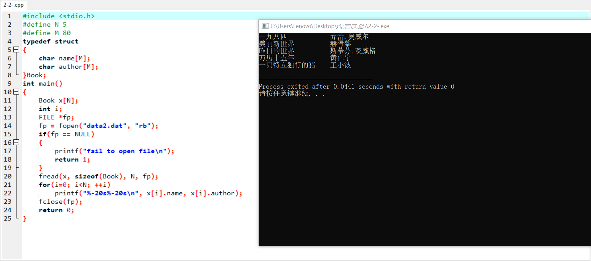 #include <stdio.h> #define N 5 #define M 80 typedef struct { char name[M]; char author[M]; }Book; int main() { Book x[N]; int i; FILE *fp; fp = fopen("data2.dat", "rb"); if(fp == NULL) { printf("fail to open file\n"); return 1; } fread(x, sizeof(Book), N, fp); for(i=0; i<N; ++i) printf("%-20s%-20s\n", x[i].name, x[i].author); fclose(fp); return 0; }