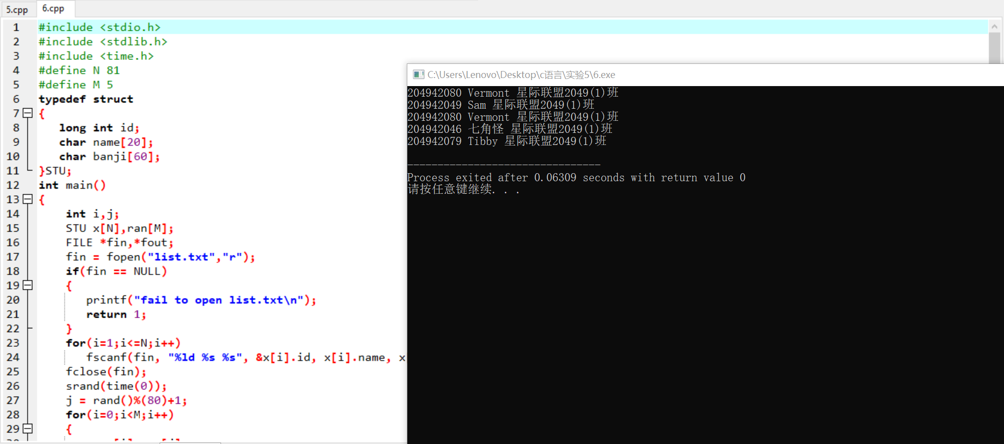 #include <stdio.h> #include <stdlib.h> #include <time.h> #define N 81 #define M 5 typedef struct { long int id; char name[20]; char banji[60]; }STU; int main() { int i,j; STU x[N],ran[M]; FILE *fin,*fout; fin = fopen("list.txt","r"); if(fin == NULL) { printf("fail to open list.txt\n"); return 1; } for(i=1;i<=N;i++) fscanf(fin, "%ld %s %s", &x[i].id, x[i].name, x[i].banji); fclose(fin); srand(time(0)); j = rand()%(80)+1; for(i=0;i<M;i++) { ran[i] = x[j]; j = rand()%(80)+1; } fout = fopen("lucky.txt", "w"); if(fout == NULL) { printf("fail to open file\n"); return 1; } for(i=0;i<M;i++) { fprintf(fout, "%ld %s %s\n", ran[i].id, ran[i].name, ran[i].banji); printf("%ld %s %s\n", ran[i].id, ran[i].name, ran[i].banji); } fclose(fout); return 0; }