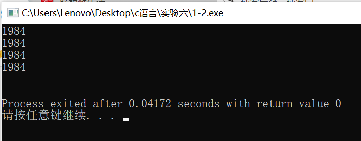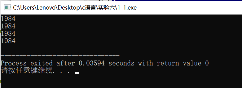 #include <stdio.h> #define N 4 int main() { char x[N] = {'1', '9', '8', '4'}; int i; char *p; // 方式1:通过数组名和下标遍历输出数组元素 for(i=0; i<N; ++i) printf("%c", x[i]); printf("\n"); // 方式2:通过指针变量遍历输出数组元素 (写法1) for(p=x; p<x+N; ++p) printf("%c", *p); printf("\n"); // 方式2:通过指针变量遍历输出数组元素(写法2) p = x; for(i=0; i<N; ++i) printf("%c", *(p+i)); printf("\n"); // 方式2:通过指针变量遍历输出数组元素(写法3) p = x; for(i=0; i<N; ++i) printf("%c", p[i]); printf("\n"); return 0; }