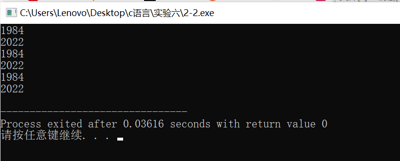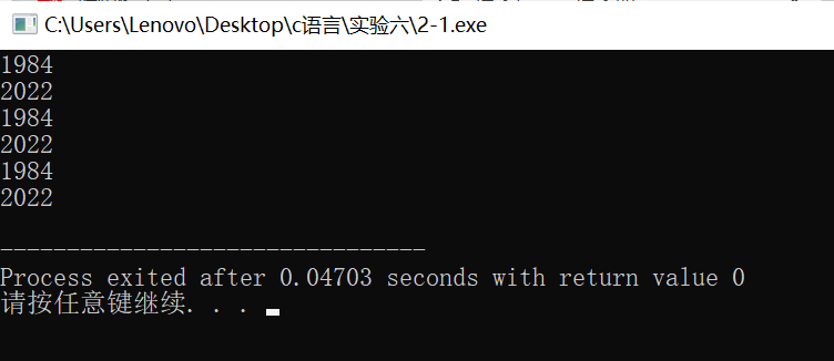 #include <stdio.h> int main() { char x[2][4] = { {'1', '9', '8', '4'}, {'2', '0', '2', '2'} }; int i, j; char *p; // 指针变量,存放char类型数据的地址 char (*q)[4]; // 指针变量,指向包含4个char型元素的一维数组 // 使用数组名、下标访问二维数组元素 for(i=0; i<2; ++i) { for(j=0; j<4; ++j) printf("%c", x[i][j]); printf("\n"); } // 使用指针变量p间接访问二维数组元素 for(p = &x[0][0], i = 0; p < &x[0][0] + 8; ++p, ++i) { printf("%c", *p); if( (i+1)%4 == 0) printf("\n"); } // 使用指针变量q间接访问二维数组元素 for(q=x; q<x+2; ++q) { for(j=0; j<4; ++j) printf("%c", *(*q+j)); printf("\n"); } return 0; }
