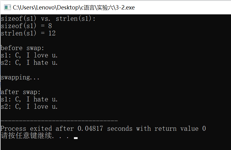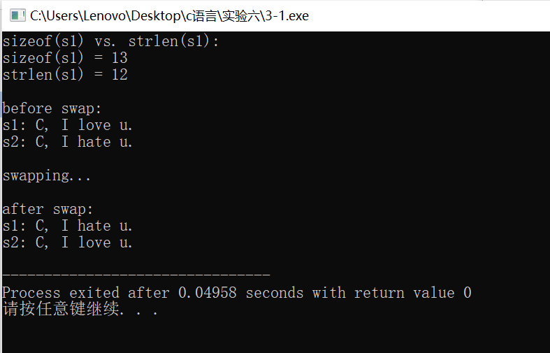 #include <stdio.h> #include <string.h> #define N 80 int main() { char *s1 = "C, I love u."; char *s2 = "C, I hate u."; char *tmp; printf("sizeof(s1) vs. strlen(s1): \n"); printf("sizeof(s1) = %d\n", sizeof(s1)); printf("strlen(s1) = %d\n", strlen(s1)); printf("\nbefore swap: \n"); printf("s1: %s\n", s1); printf("s2: %s\n", s2); printf("\nswapping...\n"); tmp = s1; s1 = s2; s2 = tmp; printf("\nafter swap: \n"); printf("s1: %s\n", s1); printf("s2: %s\n", s2); return 0; }