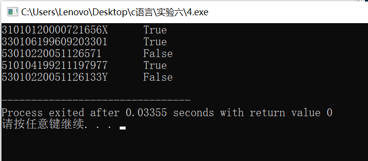 #include <stdio.h> #include <string.h> #define N 5 int check_id(char *str); // 函数声明 int main() { char *pid[N] = {"31010120000721656X", "330106199609203301", "53010220051126571", "510104199211197977", "53010220051126133Y"}; int i; for(i=0; i<N; ++i) if( check_id(pid[i]) ) // 函数调用 printf("%s\tTrue\n", pid[i]); else printf("%s\tFalse\n", pid[i]); return 0; } // 函数定义 // 功能: 检查指针str指向的身份证号码串形式上是否合法。 // 形式合法,返回1,否则,返回0 int check_id(char *str) { int i,j; char *temp; for(i=1;i<=N;++i) { if(strlen(str)!=18) { return 0; break; } else { temp=str; for(;temp<str+18;temp++) { if(*temp>='0'&&*temp<='9'||*temp == 'X'); else { return 0; break; } } if(temp=str+18) return 1; } } }
