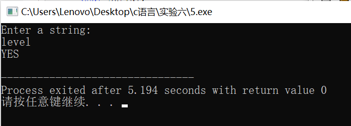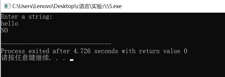#include <stdio.h> #include <string.h> #define N 80 int is_palindrome(char *s); // 函数声明 int main() { char str[N]; int flag; printf("Enter a string:\n"); gets(str); flag = is_palindrome(str); // 函数调用 if (flag) printf("YES\n"); else printf("NO\n"); return 0; } // 函数定义 // 功能:判断s指向的字符串是否是回文串 // 如果是,返回1;否则,返回0 int is_palindrome(char *s) { int i,j; for(j=strlen(s)-1,i=0;i<j;i++,j--) if(s[i]==s[j]) return 1; else return 0; }