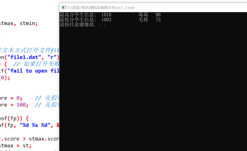 #include <stdio.h> #include <stdlib.h> #define N 10 // 定义一个结构体类型STU typedef struct student { int num; char name[20]; int score; }STU; int main() { FILE *fin; STU st[N]; int i; // 以只读文本方式打开二进制文件file4.dat fin = fopen("file4.dat", "rb"); if( !fin ) { // 如果打开失败,则输出错误提示信息,然后退出程序 printf("fail to open file4.dat\n"); exit(0); } // 从fin指向的数据文件file4.dat中读取数据到结构体数组st for(i=0; i<N; i++) fread(&st,sizeof(STU),N,fin); // 将数组st中数据输出到屏幕 for(i=0; i<N; i++) printf("%-6d%-10s%3d\n", st[i].num, st[i].name, st[i].score); return 0; }
