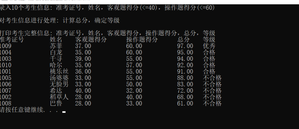 #include <stdio.h> #include <stdlib.h> #include <string.h> const int N = 10; // 定义结构体类型struct student,并定义其别名为STU typedef struct student { long int id; char name[20]; float objective; /*客观题得分*/ float subjective; /*操作题得分*/ float sum; char level[10]; }STU; // 函数声明 void input(STU s[], int n); void output(STU s[], int n); void process(STU s[], int n); int main() { STU stu[N]; printf("录入%d个考生信息: 准考证号,姓名,客观题得分(<=40),操作题得分(<=60)\n", N); input(stu, N); printf("\n对考生信息进行处理: 计算总分,确定等级\n"); process(stu, N); printf("\n打印考生完整信息: 准考证号,姓名,客观题得分,操作题得分,总分,等级\n"); output(stu, N); system("pause"); return 0; } // 从文本文件examinee.txt读入考生信息:准考证号,姓名,客观题得分,操作题得分 void input(STU s[], int n) { // 补足代码 // ××× FILE *fp1; int i; fp1=fopen("examinee.txt","r"); if(!fp1) { printf("fail to open examinee.txt\n"); exit(0); } for(i=0;i<n;i++) fscanf(fp1, "%ld %s %f %f",&s[i].id,&s[i].name,&s[i].objective,&s[i].subjective); fclose(fp1); } // 输出考生完整信息: 准考证号,姓名,客观题得分,操作题得分,总分,等级 // 不仅输出到屏幕上,还写到文本文件result.txt中 void output(STU s[], int n) { // 补足代码 // ××× int i; FILE *fp2; fp2=fopen("result.txt","w"); for(i=0;i<n;i++){ printf("%ld %s %f %f %f %s\n",s[i].id,s[i].name,s[i].objective,s[i].subjective,s[i].sum,s[i].level); fprintf(fp2,"%ld %s %f %f %f %s\n",s[i].id,s[i].name,s[i].objective,s[i].subjective,s[i].sum,s[i].level); } fclose(fp2); } // 对考生信息进行处理:计算总分,排序,确定等级 void process(STU s[], int n) { // 补足代码 // ××× int i,j,k; STU m; for(i=0;i<n;i++) s[i].sum=s[i].objective+s[i].subjective; for(k=0;k<n-1;k++) { for(j=0;j<n-1-k;j++) if(s[j].sum<s[j+1].sum) { m = s[j]; s[j] = s[j+1]; s[j+1] = m; } } for(i=0;i<n;i++) { switch(i) { case 0:strcpy(s[i].level,"优秀");break; case 1: case 2: case 3: case 4:strcpy(s[i].level,"合格");break; case 5: case 6: case 7: case 8: case 9:strcpy(s[i].level,"不合格");break; } } }