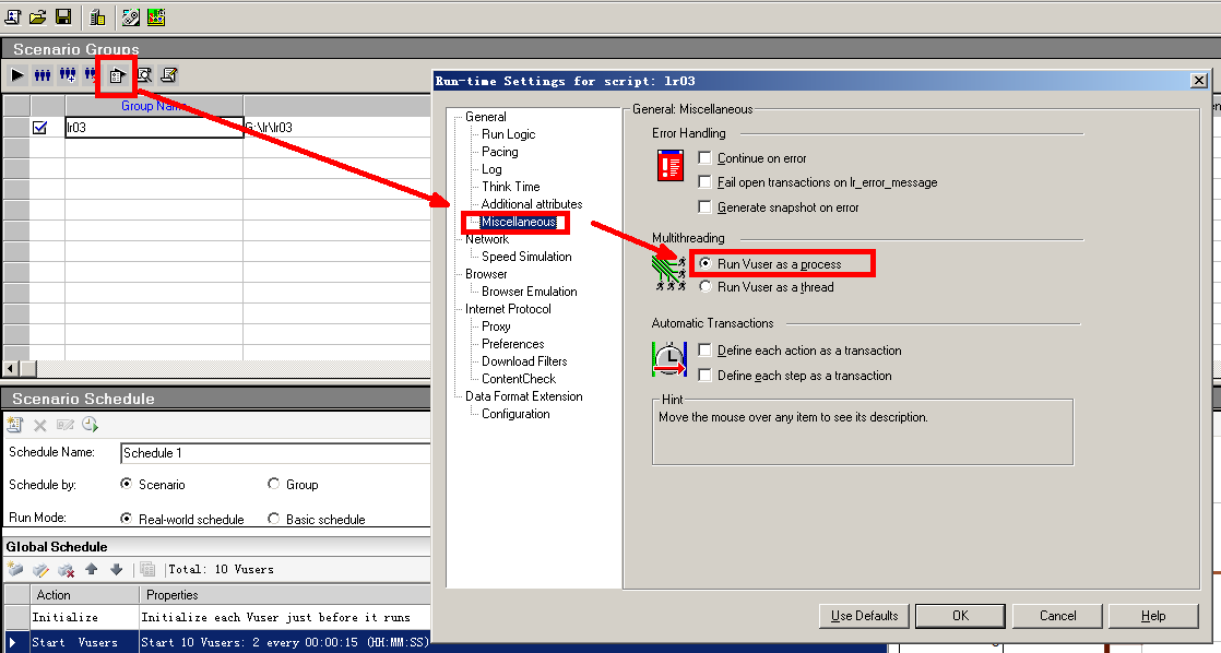 (1) Update Run-Time Settings to Run Vuser as a process.