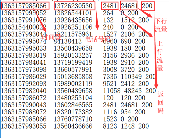static class PhoneMapper extends Mapper<LongWritable, Text, Text, Text>{ protected void map(LongWritable key, Text value, Mapper<LongWritable, Text, Text, Text>.Context context) throws IOException, InterruptedException { //读取一行数据 String line = value.toString(); //对数据进行有规则截取 String[] words = line.split("\t"); //获取有效数据 String phone = words[1]; String shang = words[2]; String xia = words[3]; //写入上下文 context.write(new Text(phone), new Text(shang +","+xia)); } }
