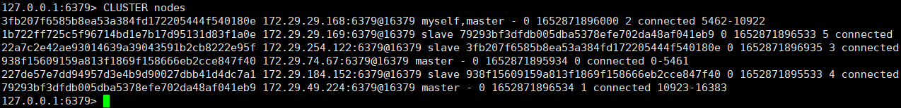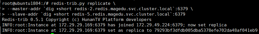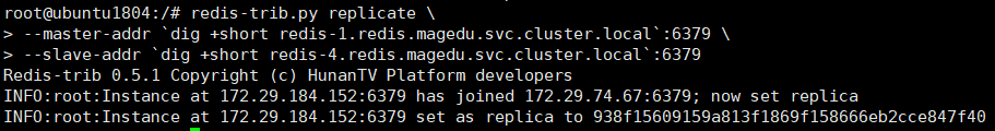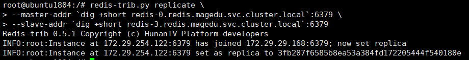 ## 运行容器 kubectl run -it ubuntu1804 --image=ubuntu:18.04 --restart=Never -n magedu bash ##基础环境准备 apt update apt install python2.7 python-pip redis-tools dnsutils iputils-ping net-tools pip install --upgrade pip pip install redis-trib==0.5.1 ## 初始化master redis-trib.py create \ `dig +short redis-0.redis.magedu.svc.cluster.local`:6379 \ `dig +short redis-1.redis.magedu.svc.cluster.local`:6379 \ `dig +short redis-2.redis.magedu.svc.cluster.local`:6379 ## redis3加入redis0 redis-trib.py replicate \ --master-addr `dig +short redis-0.redis.magedu.svc.cluster.local`:6379 \ --slave-addr `dig +short redis-3.redis.magedu.svc.cluster.local`:6379 ## redis4加入redis1 redis-trib.py replicate \ --master-addr `dig +short redis-1.redis.magedu.svc.cluster.local`:6379 \ --slave-addr `dig +short redis-4.redis.magedu.svc.cluster.local`:6379 ## redis5加入redis2 redis-trib.py replicate \ --master-addr `dig +short redis-2.redis.magedu.svc.cluster.local`:6379 \ --slave-addr `dig +short redis-5.redis.magedu.svc.cluster.local`:6379