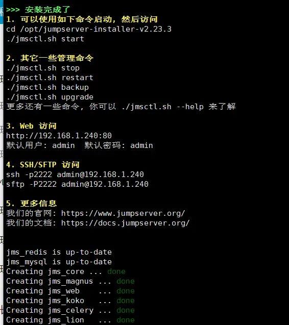 至此,JumpServer的安装已经完成啦,后面我们会学习JumpServer的使用;高可用、双主的JumpServer部署!