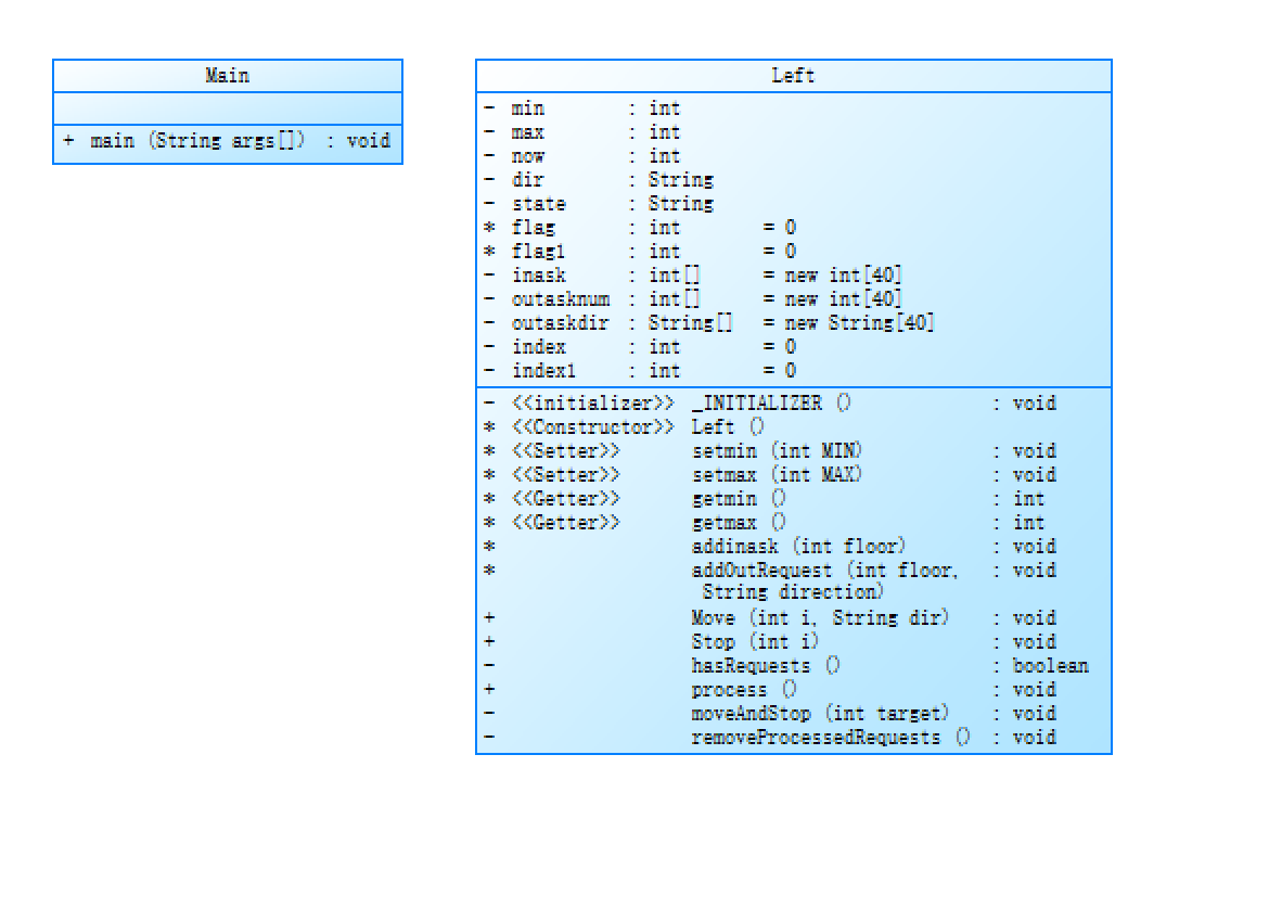 类设计与06一致,只需要在之前逻辑上将外部队列的请求楼层(nowfloor1)与外部乘客的所在楼层(nowfloor)进行比较,即可得到外部队列的请求方向,再在外部队列出队时,调用添加内部队列的方法(request.addinask(nowfloor1);),即可套用与上一次算法逻辑相同的代码