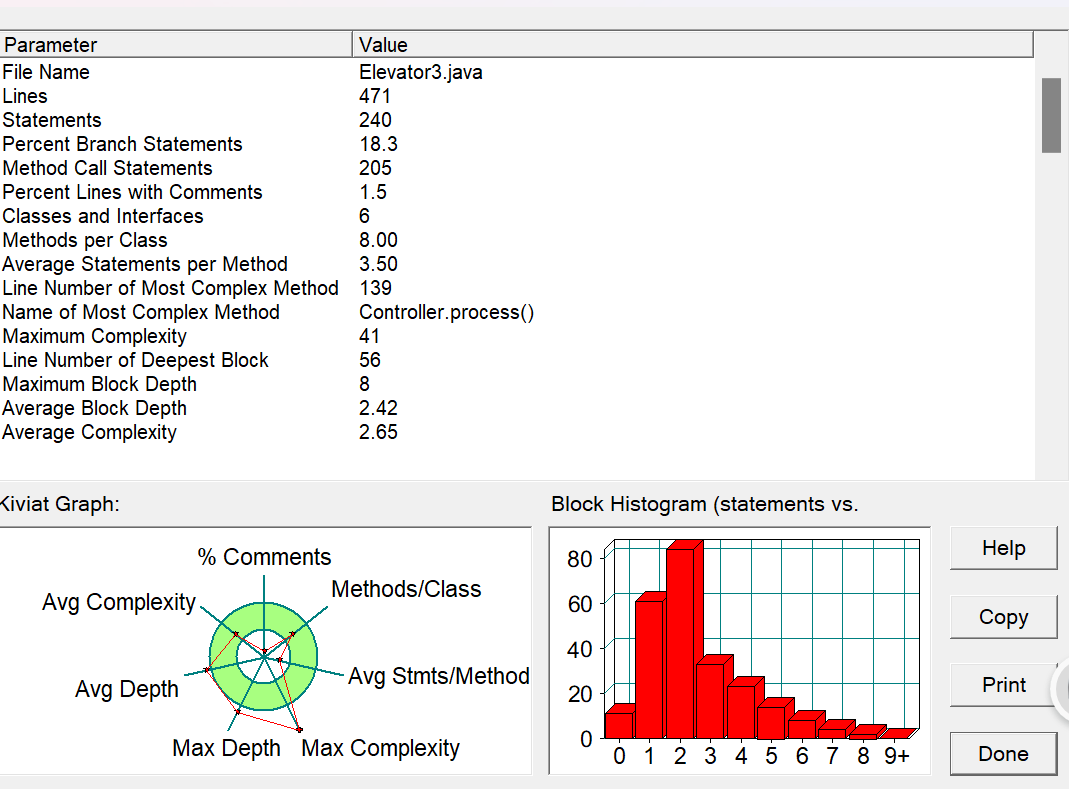 总语句数较多,主要集中在 Controller.process() 和输入部分,包含大量条件分支和循环,可读性较差。 -