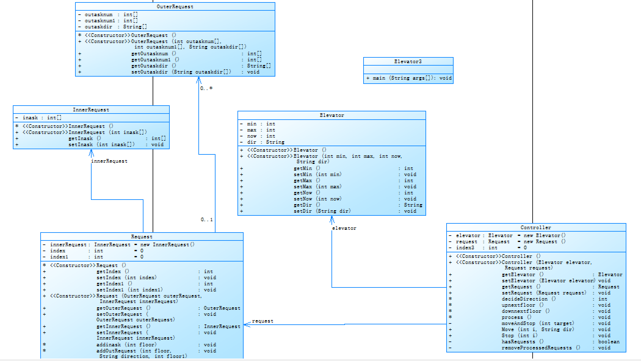第一次电梯题目由于要求只涉及了一个类,因此对于类与类之间的关系与调用并没有考察,只是花时间去思考电梯的调度算法,这里是LOOK算法,通过大模型去查找了电梯的相关算法并学习,以及正则表达式的应用(通过正则表达式来获取内部与外部的请求) - 第二次电梯