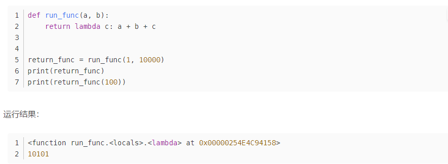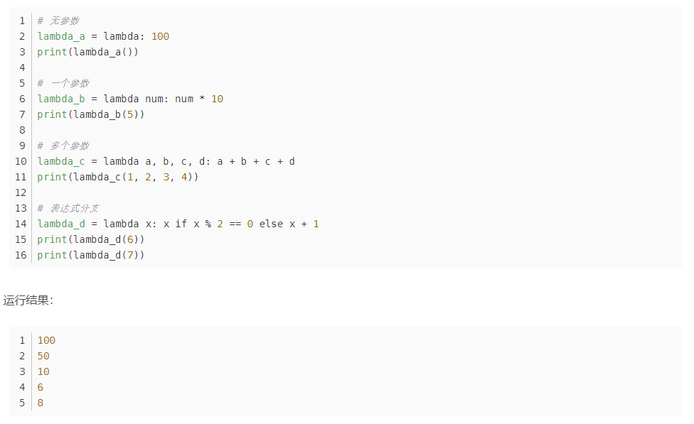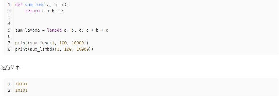 可以看到,lambda适用于多个参数、一个返回值的情况,可以用一个变量来接收,变量是一个函数对象,执行这个函数对象的结果与执行一个普通函数的结果一样