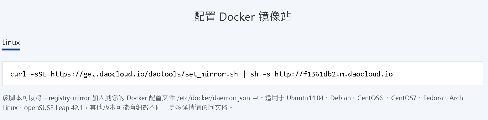 执行成功之后会在 /etc/docker/daemon.json 中加入 {"registry-mirrors": ["http://f1361db2.m.daocloud.io"],} 配置