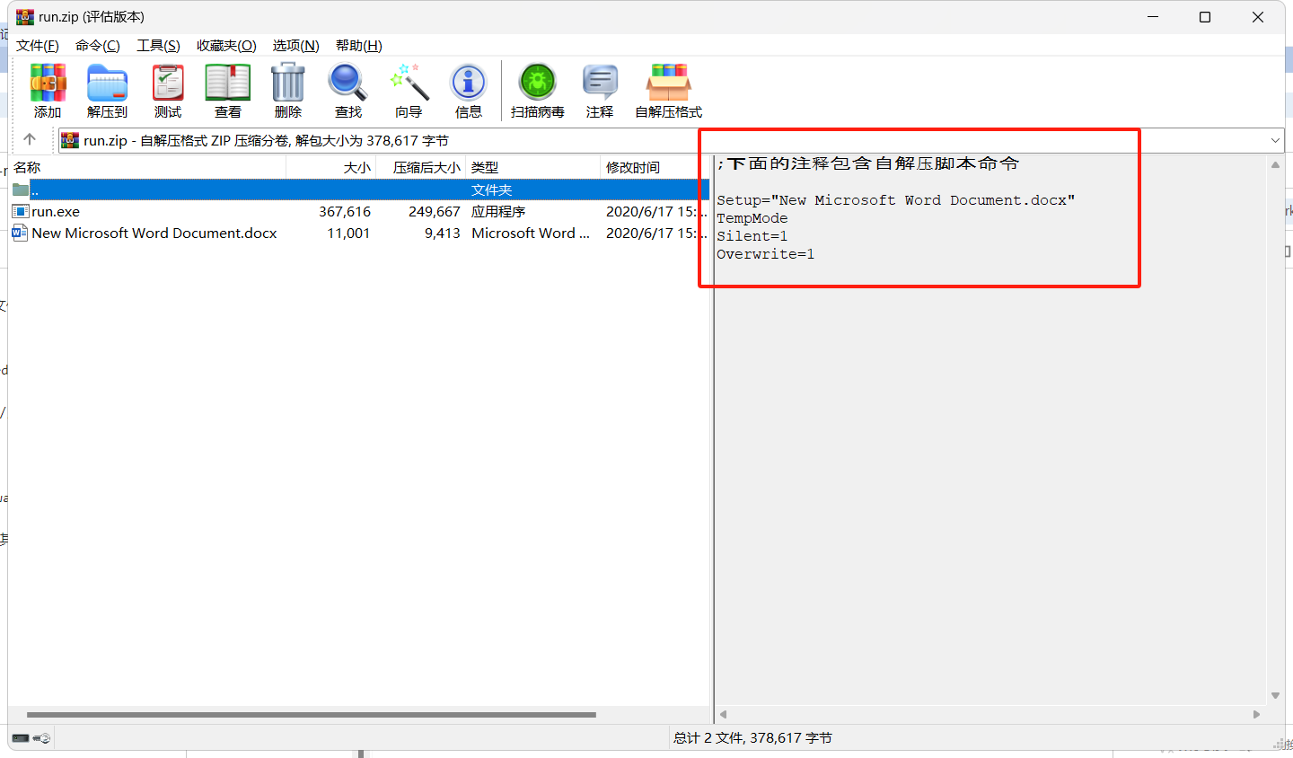 这里面可看到这个压缩包存在自解压命令,这也解释了为什么之前运行它会跳出word视图