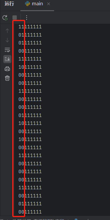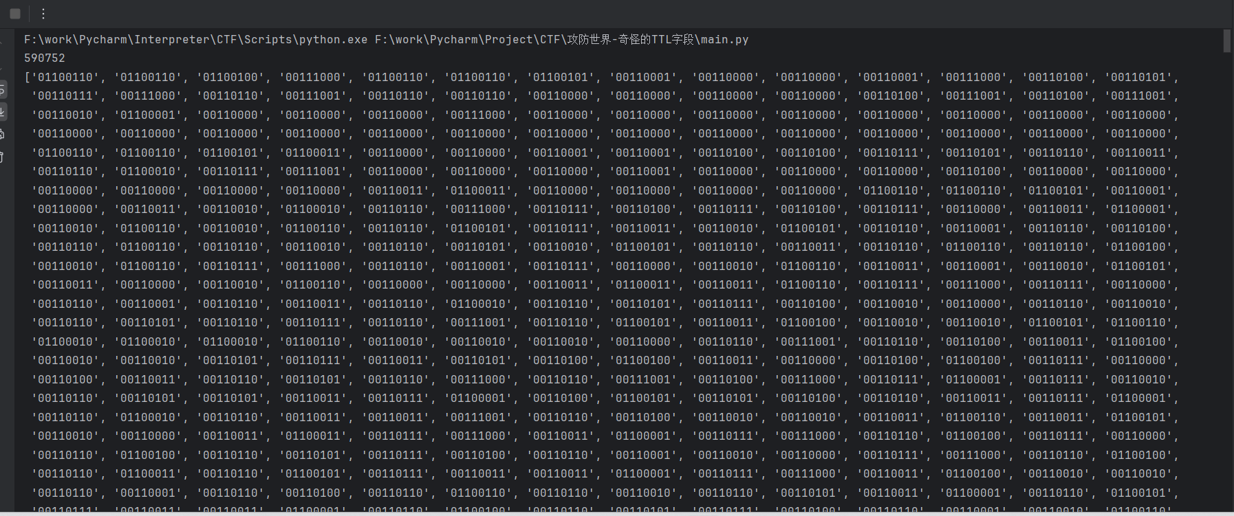 3、转为二进制输出一遍看看,发现所有数据的后六位都是1,仅有前2位不同,如果有数据就是隐藏在这前两位中