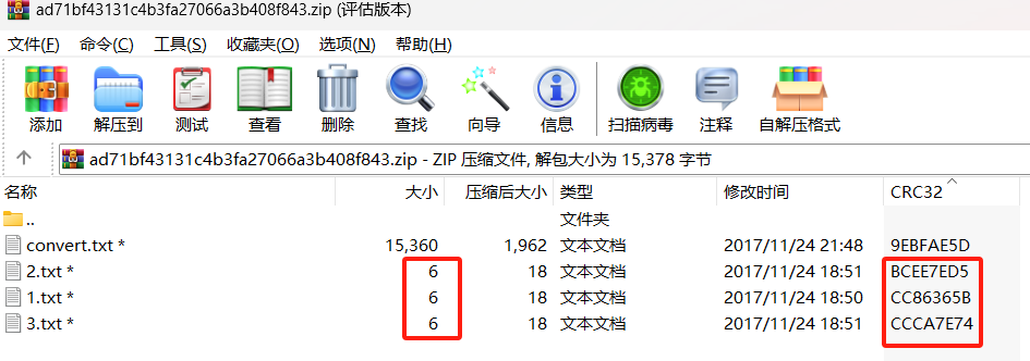 4、点开压缩包预览文件,发现里面有三个较小的txt文本,又想到标题叫crc,猜测是crc爆破