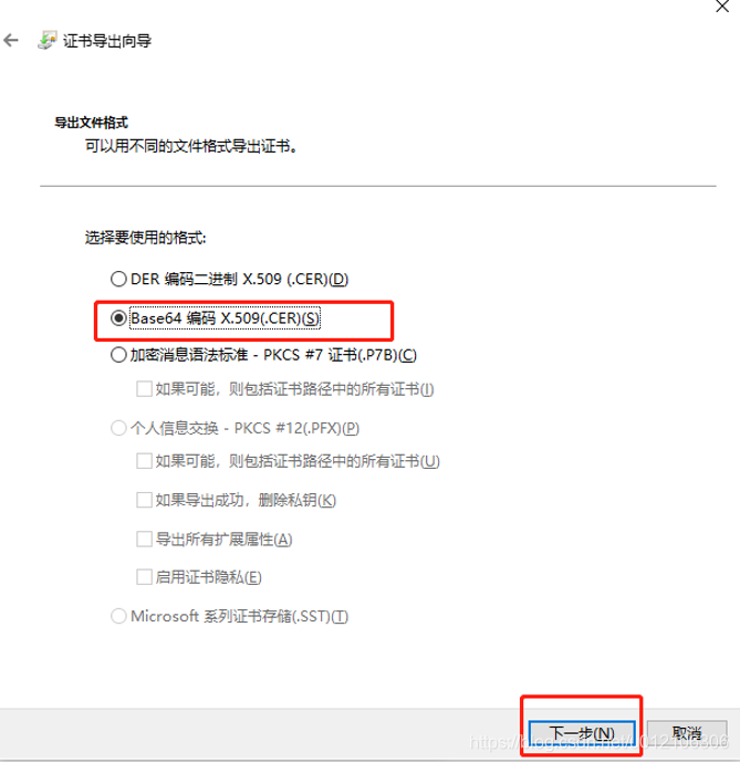 - 点击下一步—点击Base64编码X.509.CER格式—点击下一步