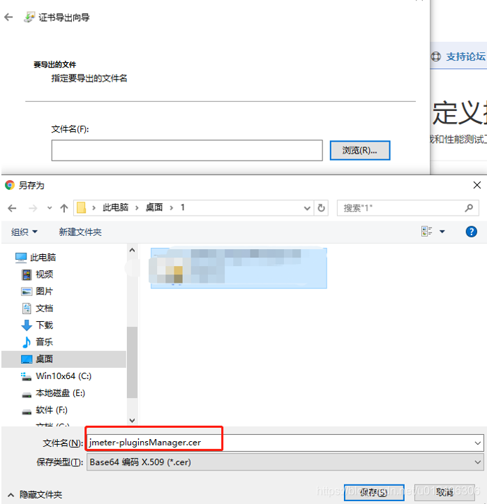 - 点击浏览–选择一个路径–输入保存文件的名称,点击保存即可。可以命名:jmeter-pluginsManager.cer