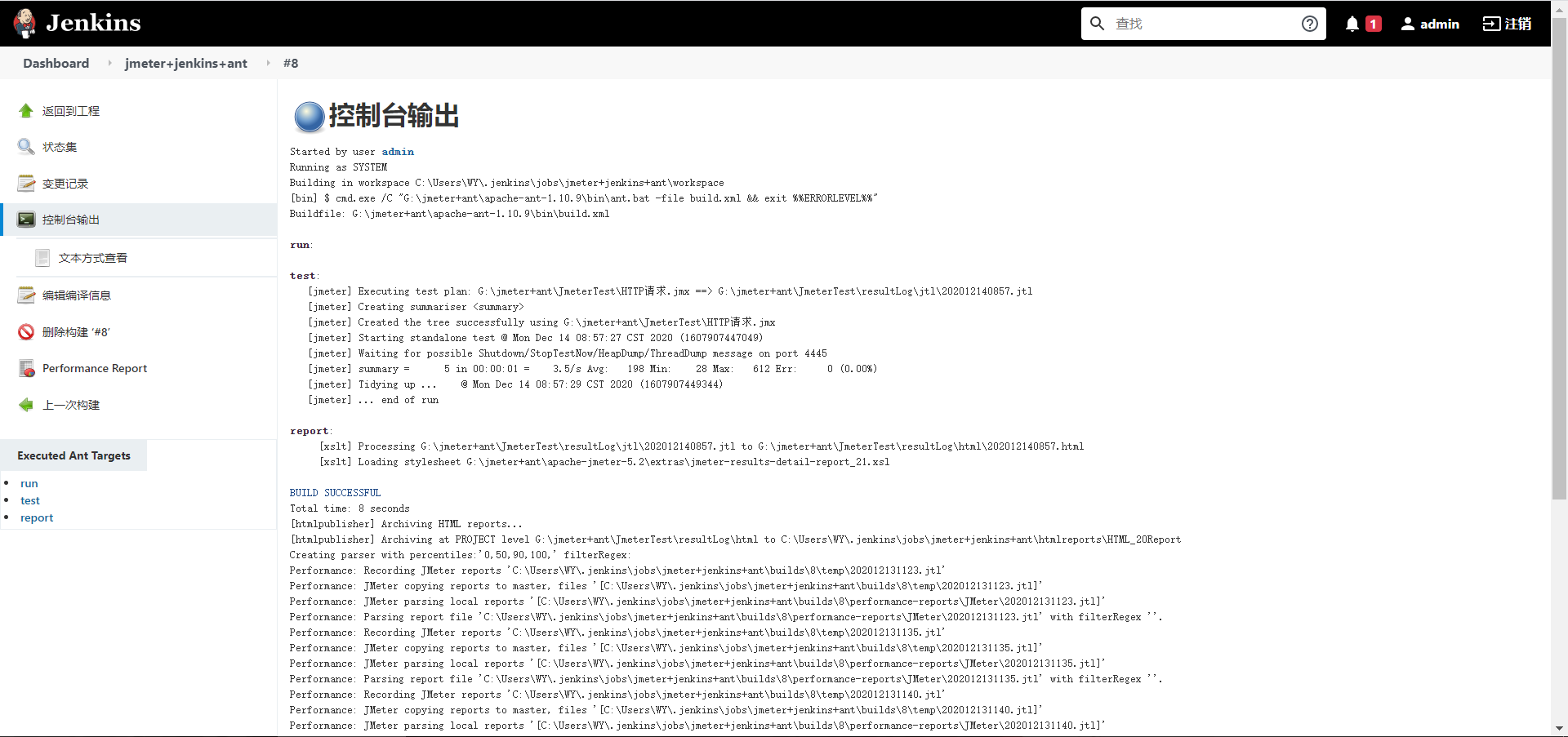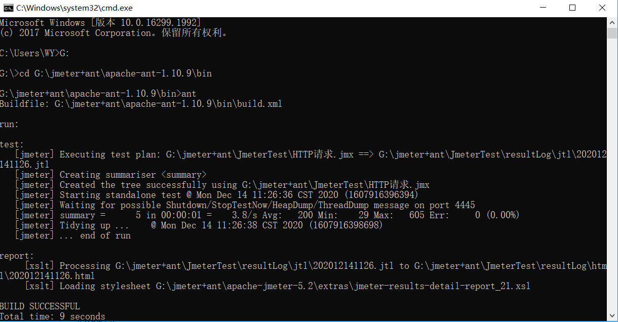 9.命令行进入放置测试用的jmx文件的文件夹,我这里的jmx放在G:\jmeter+ant\JmeterTest这个目录下,执行ant命令