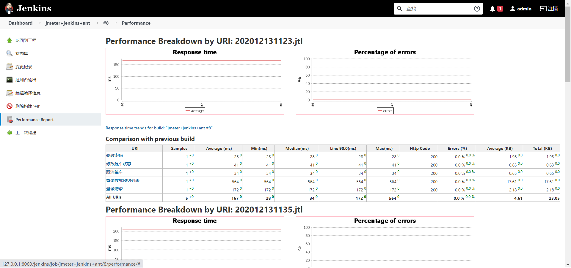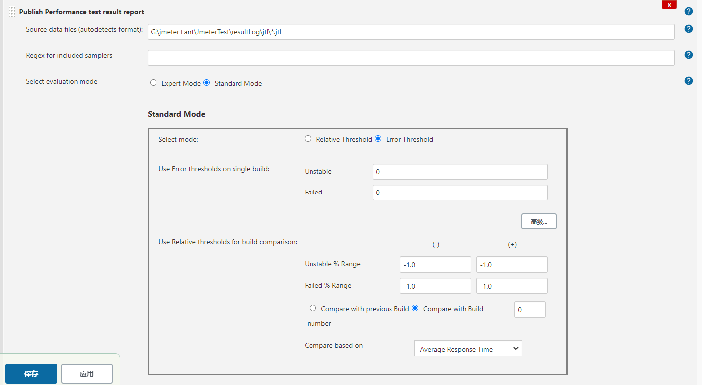 <?xml version="1.0" encoding="UTF-8"?> <project name="ant-jmeter-test" default="run" basedir="."> <tstamp> <format property="time" pattern="yyyyMMddhhmm" /> </tstamp> <property name="basedirectory" value="G:\jmeter+ant\apache-jmeter-5.2\extras" /> <!-- 需要改成自己本地的 Jmeter 目录--> <property name="jmeter.home" value="G:\jmeter+ant\apache-jmeter-5.2" /> <!-- jmeter生成jtl格式的结果报告的路径--> <property name="jmeter.result.jtl.dir" value="G:\jmeter+ant\JmeterTest\resultLog\jtl" /> <!-- jmeter生成html格式的结果报告的路径--> <property name="jmeter.result.html.dir" value="G:\jmeter+ant\JmeterTest\resultLog\html" /> <!-- Name of test (without .jmx) --> <property name="test" value="Test"/> <!-- 生成的报告的前缀--> <property name="ReportName" value="TestReport" /> <property name="jmeter.result.jtlName" value="${jmeter.result.jtl.dir}/${time}.jtl" /> <property name="jmeter.result.htmlName" value="${jmeter.result.html.dir}/${time}.html" /> <path id="xslt.classpath"> <fileset dir="${jmeter.home}/lib" includes="xalan*.jar"/> <fileset dir="${jmeter.home}/lib" includes="serializer*.jar"/> </path> <target name="run"> <antcall target="test" /> <antcall target="report" /> </target> <target name="test"> <taskdef name="jmeter" classname="org.programmerplanet.ant.taskdefs.jmeter.JMeterTask" /> <jmeter jmeterhome="${jmeter.home}" resultlog="${jmeter.result.jtlName}"> <!-- 声明要运行的脚本。"*.jmx"指包含此目录下的所有jmeter脚本--> <testplans dir="G:\jmeter+ant\JmeterTest" includes="*.jmx" /> </jmeter> </target> <target name="report"> <tstamp> <format property="report.datestamp" pattern="yyyy/MM/dd HH:mm" /></tstamp> <xslt classpathref="xslt.classpath" force="true" in="${jmeter.result.jtlName}" out="${jmeter.result.htmlName}" style="${jmeter.home}/extras/jmeter-results-detail-report_21.xsl"> <param name="dateReport" expression="${report.datestamp}"/> </xslt> <copy todir="${jmeter.result.html.dir}"> <fileset dir="${jmeter.home}/extras"> <include name="collapse.png" /> <include name="expand.png" /> </fileset> </copy> </target> </project>