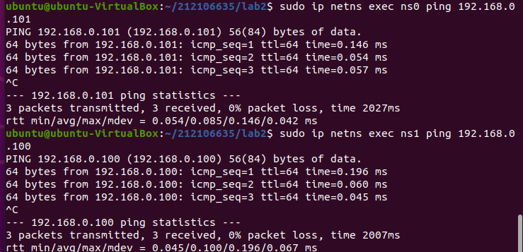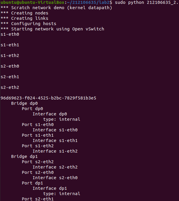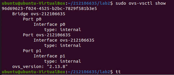 a) /home/用户名/学号/lab2/目录下执行ovs-vsctl show命令、以及p0和p1连通性测试的执行结果截图: