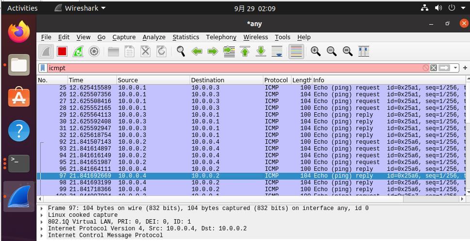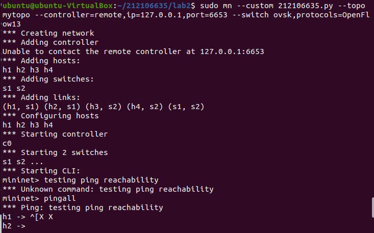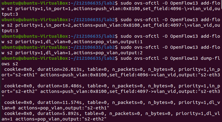 b) /home/用户名/学号/lab2/目录下开启Mininet CLI并执行pingall命令的截图、上述目录下查看OVS流表的命令结果截图,wireshark抓包截图